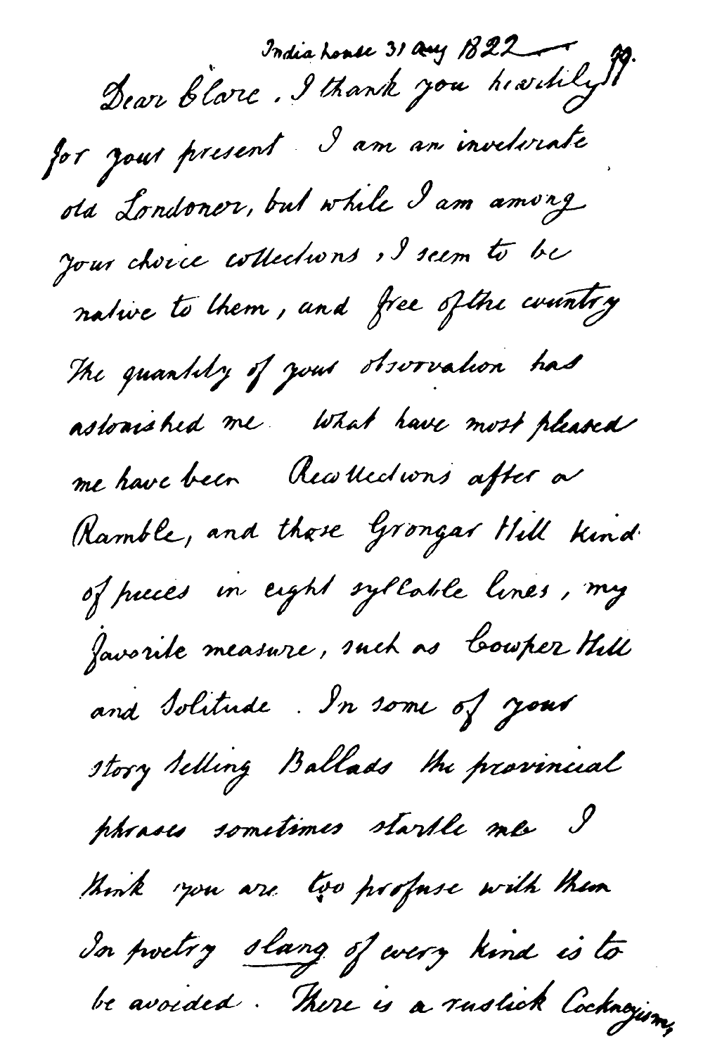 When you come London-ward you will find me no longer in Covt Gard. I have a Cottage, in Colebrook row, Islington. A cottage, for it is detach'd; a white house, with 6 good rooms; the New River (rather elderly by this time) runs (if a moderate walking pace can be so termed) close to the foot of the house; and behind is a spacious garden, with vines (I assure you), pears, strawberries, parsnips, leeks, carrots, cabbages, to delight the heart of old Alcinous. You enter without passage into a cheerful dining-room, all studded over and rough with old Books, and above is a lightsome Drawing-room 3 windows, full of choice prints. I feel like a great Lord, never having had a house before....