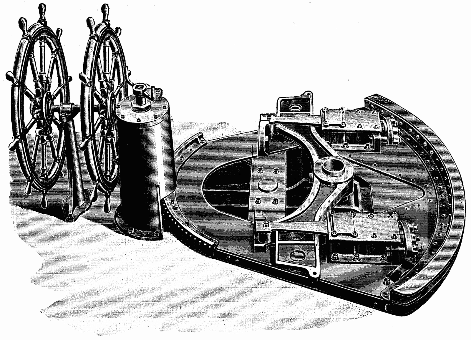 Being carried on its own center, and not, as is usual, on the rudder stock, and with its rim supported on rollers, the quadrant does not impose upon the rudder pintles any of its own weight, thus diminishing the wear on these parts. This arrangement also keeps the quadrant always in good gear with its pinion, thereby allowing the teeth of both to be strengthened by shrouding, and rendering them exempt from the effects of sinking and slogger of the rudder stock as the pintles wear. The rack and pinions are of cast steel, as is also the tiller crosshead. The spring buffers, which, as has been said, form an essential part of the quadrant, are fitted with steel rollers at the point of contact with the crosshead, thereby reducing the friction to a minimum. The springs, by their compression, absorb any shock coming on the rudder, and greatly reduce the vibration when struck by a sea. They are made adjustable, and can be either steel or rubber.