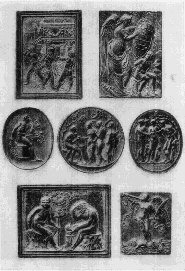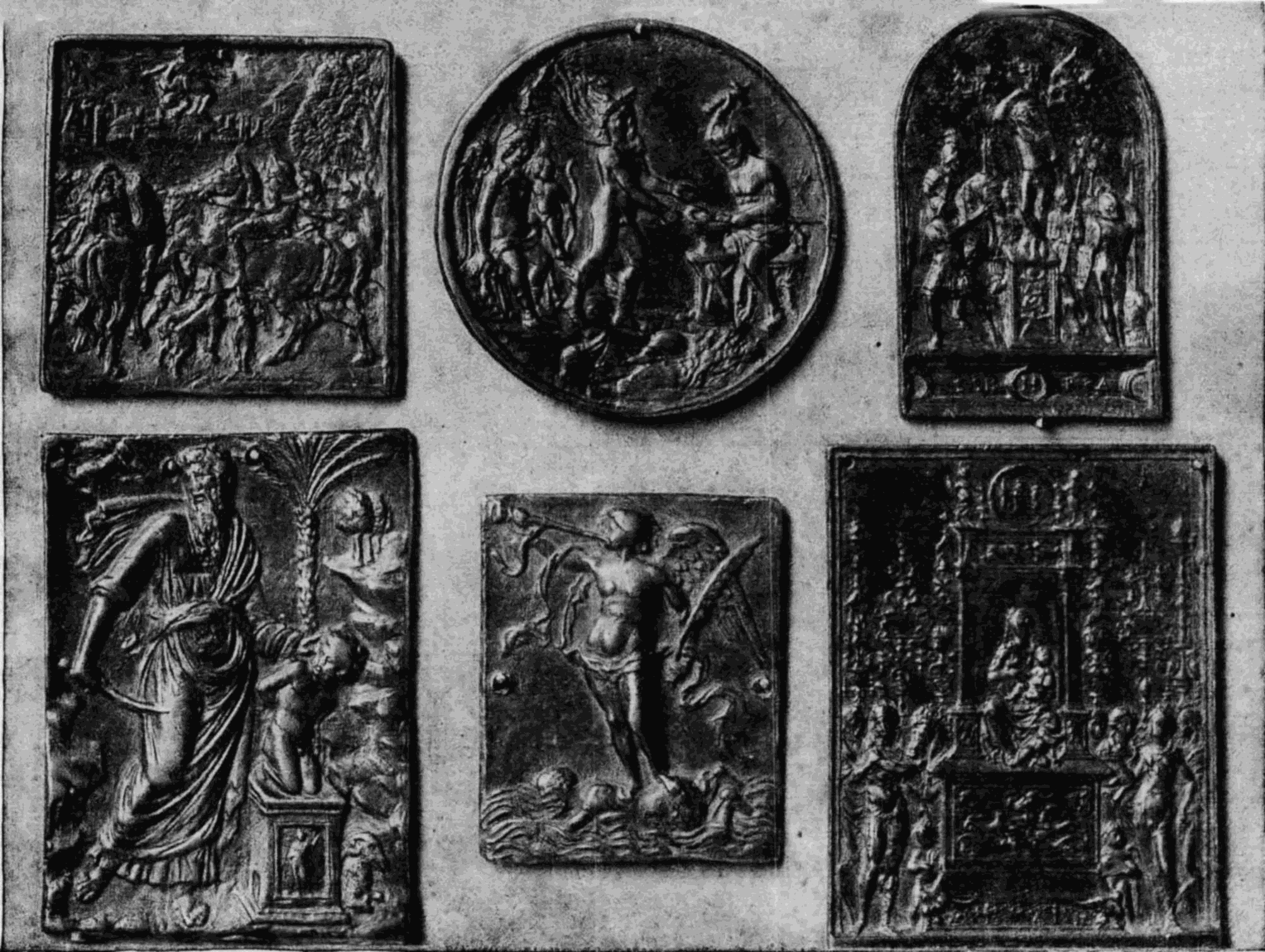 [A] Die häufigen Bleigüsse nach den kleinen Reliefs von Moderno, Valerio Belli u. a. sind zumeist spätere Nachgüsse, welche von deutschen Goldschmieden über die Bronze-Originale als Vorlagen für ihre Werkstätten angefertigt wurden.