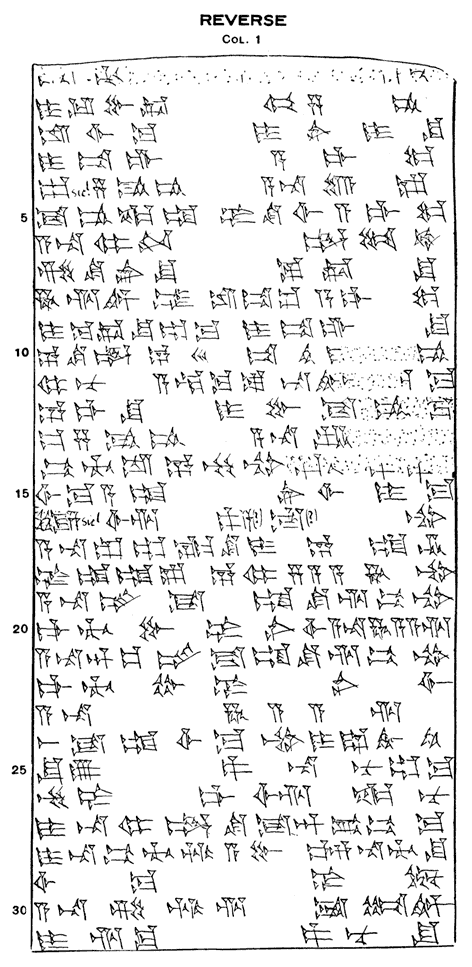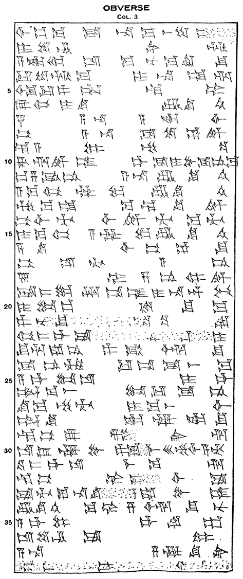 In the year 1914 the University Museum secured by purchase a large six column tablet nearly complete, carrying originally, according to the scribal note, 240 lines of text. The contents supply the South Babylonian version of the second book of the epic ša nagba imuru, “He who has seen all things,” commonly referred to as the Epic of Gilgamish. The tablet is said to have been found at Senkere, ancient Larsa near Warka, modern Arabic name for and vulgar descendant of the ancient name Uruk, the Biblical Erech mentioned in Genesis X. 10. This fact makes the new text the more interesting since the legend of Gilgamish is said to have originated at Erech and the hero in fact figures as one of the prehistoric Sumerian rulers of that ancient city. The dynastic list preserved on a Nippur tablet1 mentions him as the fifth king of a legendary line of rulers at Erech, who succeeded the dynasty of Kish, a city in North Babylonia near the more famous but more recent city Babylon. The list at Erech contains the names of two well known Sumerian deities, Lugalbanda2 and Tammuz. The reign of the former is given at 1,200 years and that of Tammuz at 100 years. Gilgamish ruled 126 years. We have to do here with a confusion of myth and history in which the real facts are disengaged only by conjecture.