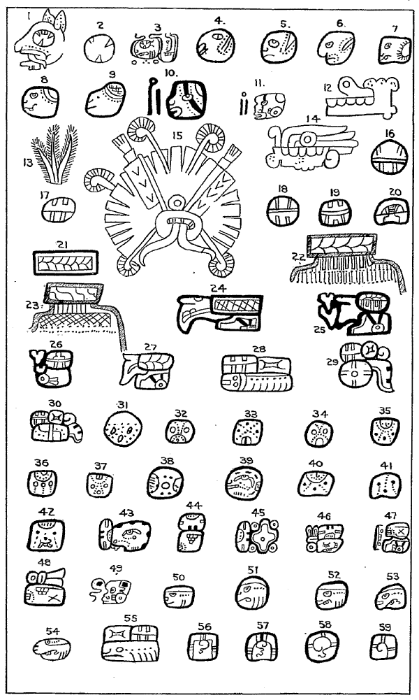 In a previous work205-1 I have expressed the opinion that the characters are to a certain extent phonetic—are not true alphabetic signs, but syllabic. And at the same time I expressed the opinion that even this definition did not hold true of all, as some were apparently ideographic, while others were simple abbreviated pictorial representations. In a subsequent paper205-2 I expressed substantially the same opinion, and gave as my belief that one reason why attempts at decipherment have failed of success is a misconception of the peculiar character of the writing, which peculiarity is found in the fact that, as it exists in the codices and inscriptions, it is in a transition stage from the purely ideographic to the phonetic. I stated also my belief that the writing had not reached the stage when each sound was indicated by a glyph or sign.[206]