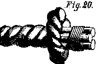 20. Pigtail finished. We pass the ends of the strands, one under the other, in the same way as if we were making a pudding splice: thus bringing it in a line with the rope, to which it is seized fast, and the ends cut off.