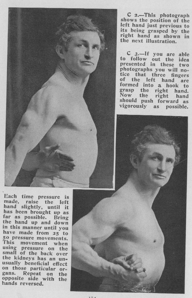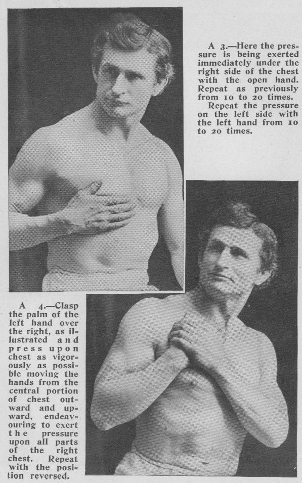 That great emphasis must be given to the importance of bringing the chin slowly but vigorously downward against the chest before the inward and backward movement is begun. This insures a proper stimulation of the thyroid gland.