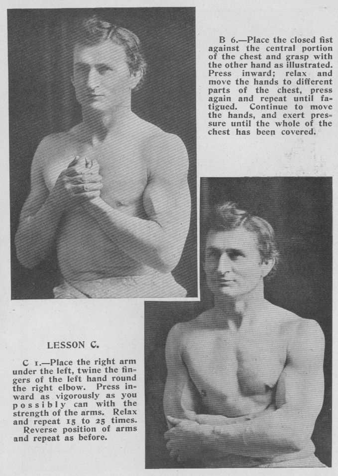 For many years I have been a student of vocal culture, having taken up the study of this art chiefly as a recreation, with no thought of ever publicly using any ability I might acquire, though I might mention that the additional vocal strength obtained as a result of this training assisted me greatly in public speaking. While giving my attention to this particular study, I was greatly impressed by the extreme importance of maintaining an erect spine, holding the chin down, inward and backward, and keeping the shoulders back and the chest expanded. I found, however, like many others who become "slack" in bodily posture, that a considerable effort was required to maintain a proper position at all times. I therefore began a series of special exercises intended really to force myself to assume a properly erect position. While experimenting with these exercises for the purpose mentioned, I noted a marked effect upon my general vital vigor. Not only was this made apparent by an increase in physical strength and stamina, but it was marked in an equal degree by additional mental energy and capacity. My mind was clearer, and I could surmount difficulties presented in business enterprises in which I was interested with far more ease than before. I could make decisions more easily and quickly. In addition, a decided gain in weight was noted-not by any