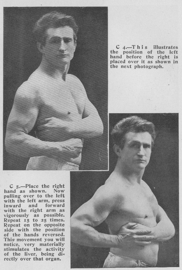 The liver, which enjoys the distinction of being the largest organ in the body, is designed for the performance of a multiplicity of functions. It not only produces the bile, which has such an important part to play in the work of digestion, but it has a very important work in the changing of foods absorbed into such material as may be assimilated or used by the cells of the various tissues throughout the body. For instance, it is part of the function of the liver to bring about chemical changes in albuminous foods which make it possible for the tissues to assimilate these. It also has much to do with bringing about certain chemical changes in sugar or dextrose. Furthermore, the liver has an important function in connection with the excretion of broken-down bodily tissue, converting this dead matter into a form in which it can be filtered out of the blood by the kidneys. Failure of the liver to perform its work satisfactorily will upset the digestive and functional system, or may lead to an accumulation of uric acid in the body, possibly resulting in rheumatism, gout, neuralgia, disturbances of circulation and other evils. When your liver "goes on strike" you may expect trouble in general. A normal condition of the entire body depends upon perfect and continuous functioning of the liver in cooperation with all the other vital organs. The same may be said of the pancreas, spleen, the thyroid gland and other organs which have a special function to perform. The body is really a combination of all these various parts and functions, and without strength and activity in all of them, simultaneous and harmonious, not one of these interdependent parts could do its work, and the body as a whole would be thrown into a state of disease. Strength of the internal organs is infinitely more important than mere muscular strength, if one could properly make a comparison.