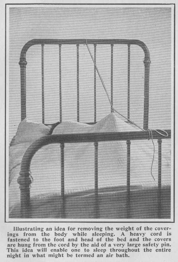 One of the most valuable remedies for those suffering from sleeplessness is to lie in an air bath during the entire night. This idea can be carried out very easily by raising the bed covering in such a way as to remove its weight from the body, thus providing what we might call a chamber of air in which to sleep. With the aid of a large safety-pin or a horse-blanket safety-pin, the bed clothing may be kept thus suspended. The safety-pin is pinned through all the coverings in the centre of the bed and then by means of a string passing through the safety-pin and running from the top of the head of the bed to the top of the foot of