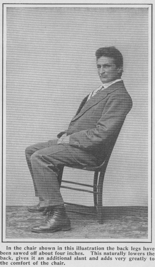 There has been much criticism of American men on the ground that they are inclined to sit down on the small of the back. They slide forward in the chair, with the back bent over and the shoulders humped forward. But the fault really lies with the construction of the chair. The back of a chair does not fit the human back, and the seat is not at the right angle to rest the body.
