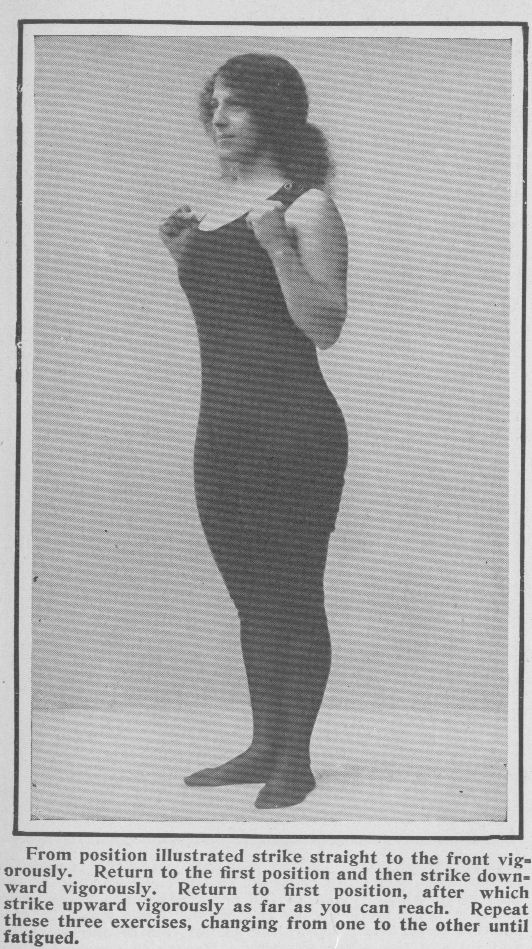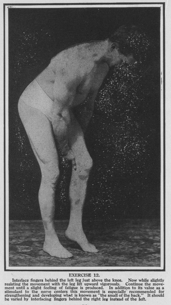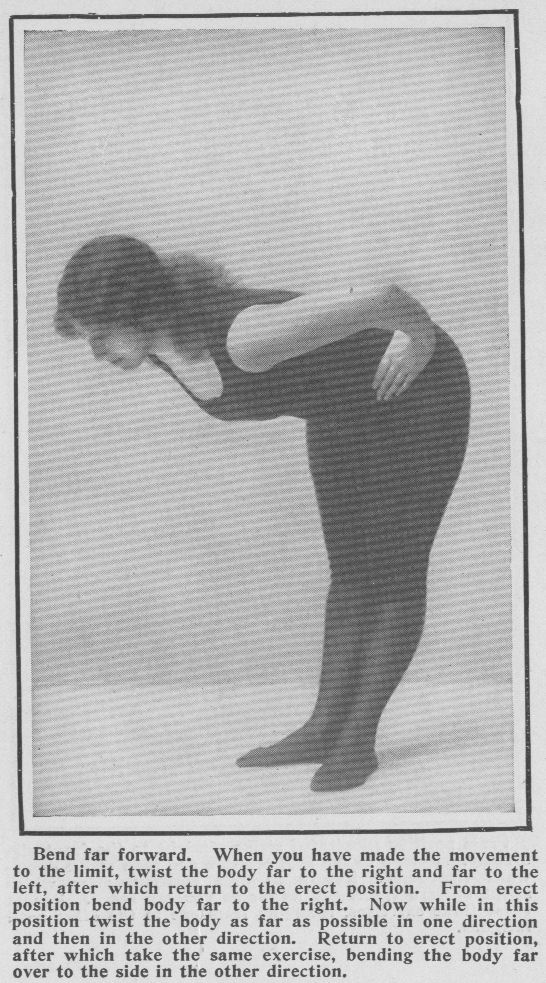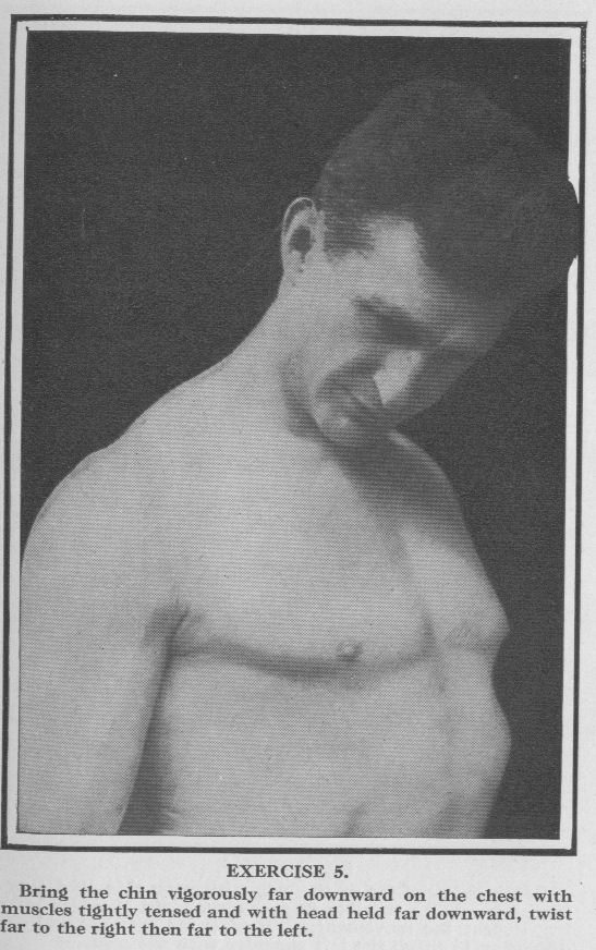 That there may be no mistake, let me reiterate: That the spine must be held erect at all times when sitting or standing. That frequently during the day when sitting or standing the chin should be brought down and in with a backward movement, the head being turned at times far either to the right or left side, with a vigorous twist of the strongly tensed muscles.