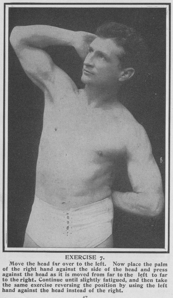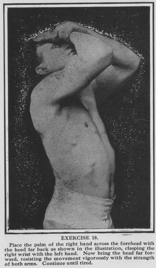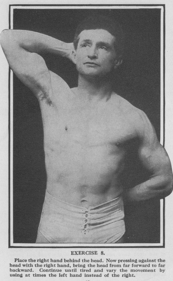 Accordingly it is well to remember in connection with these exercises that many movements which assist in the development of the neck muscles also serve to stimulate the activities of the thyroid gland. You cannot go through the process of training for a wrestling match without stimulating this organ to an exceptional degree. Therefore, in following the suggestions which are given in this chapter, you are securing the full benefit of a vitality-stimulating process that ordinarily can be obtained only by going through a prolonged course of wrestling. There is no necessity for you to develop a "bull neck," but you should make the most strenuous efforts to acquire a sufficient development of the back of the neck to give it an arched appearance. The more nearly you can approximate a development of this character, the more vital will you become. And along with this superior power will come a similar improvement in every other capacity, mental as well as physical.