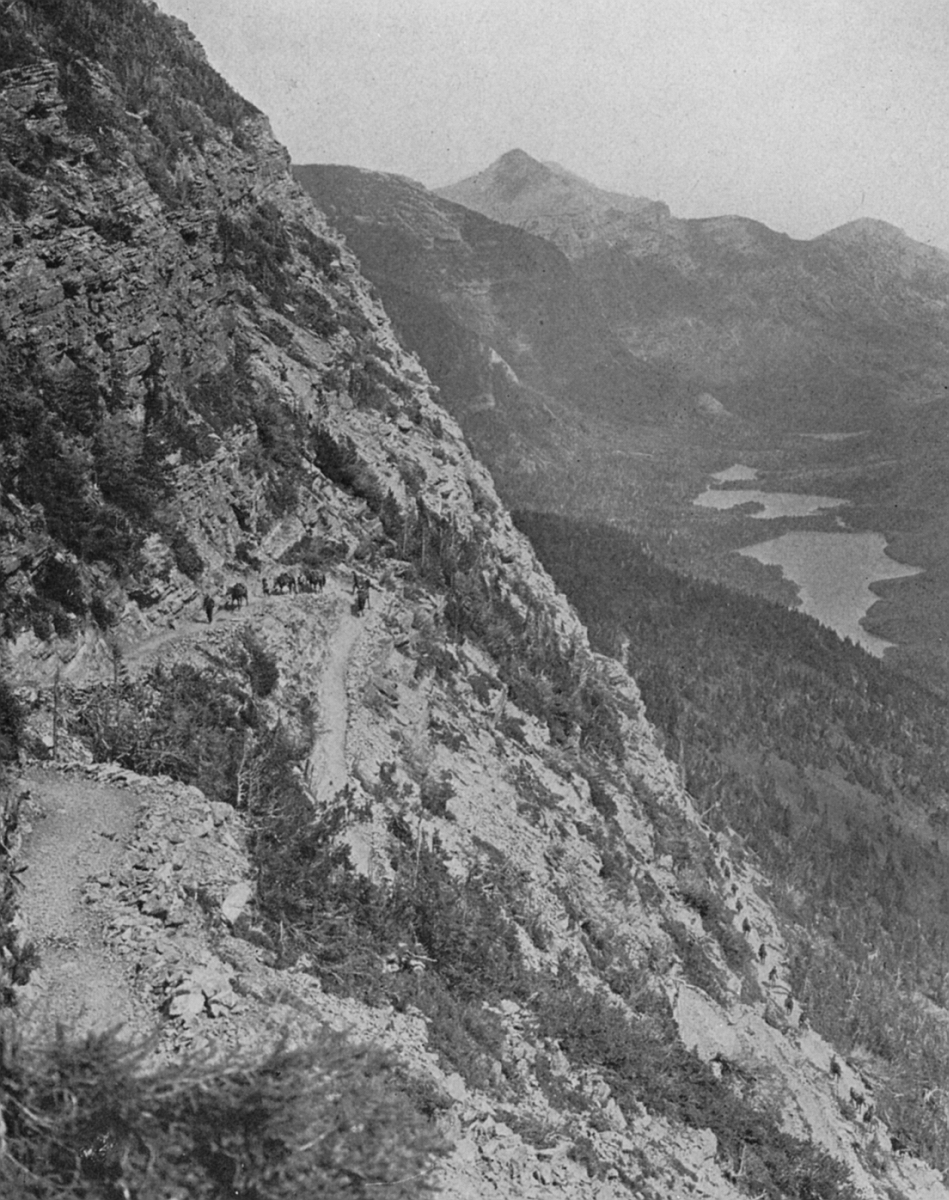 Of all the mountain-climbing I have ever done the switchback up to Doubtful Lake is the worst. We were hours doing it. There were places when it seemed no horse could possibly make the climb. Back and forth, up and up, along that narrow rock-filled trail, which was lost here in a snow-bank, there in a jungle of evergreen that hung out from the mountain-side, we were obliged to go. There was no going back. We could not have turned a horse around, nor could we have reversed the pack-outfit without losing some of the horses.