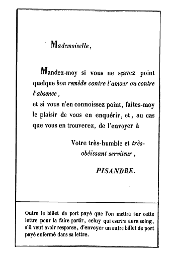 «L'invention de ces billets estant encore toute nouvelle après celle des billets de port payé qui estoit déjà establie, j'envoiez celuy cy rempli comme il est à mademoiselle de Scudéry, sous une enveloppe à madame Boquet. Elle fit la réponse qui commence: Comme j'ai toujours... 76»