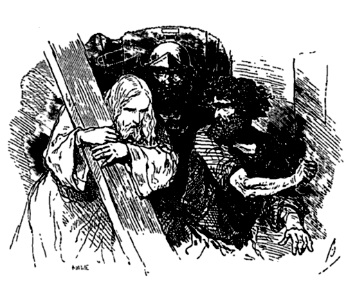 Le Juif errant chasse Jésus-Christ qui a besoin de se reposer un instant sous le faix de sa croix.