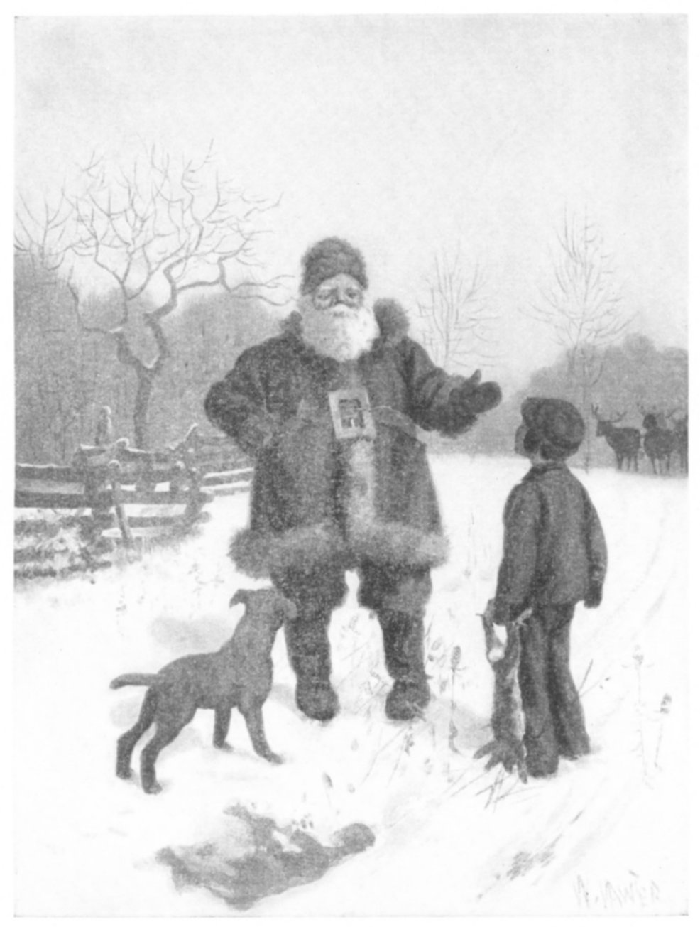 | Nen Uncle grabs th' old overcoat An' flops it over Santy's head, An' swing the door wide back an' said, "Come out, old man!—an' quick about It!—I've ist got to put you out!" An' out he sprawled him in the snow— "Now roll!" he says—"Hi-roll-ee-O!"— An' Santy, sputter'n' "Ouch! Gee-whiz!" Ist roll an' roll fer all they is! An' Trip he's out there, too,—I know, 'Cause I could hear him yappin' so— An' I heerd Santy, wunst er twic't, |