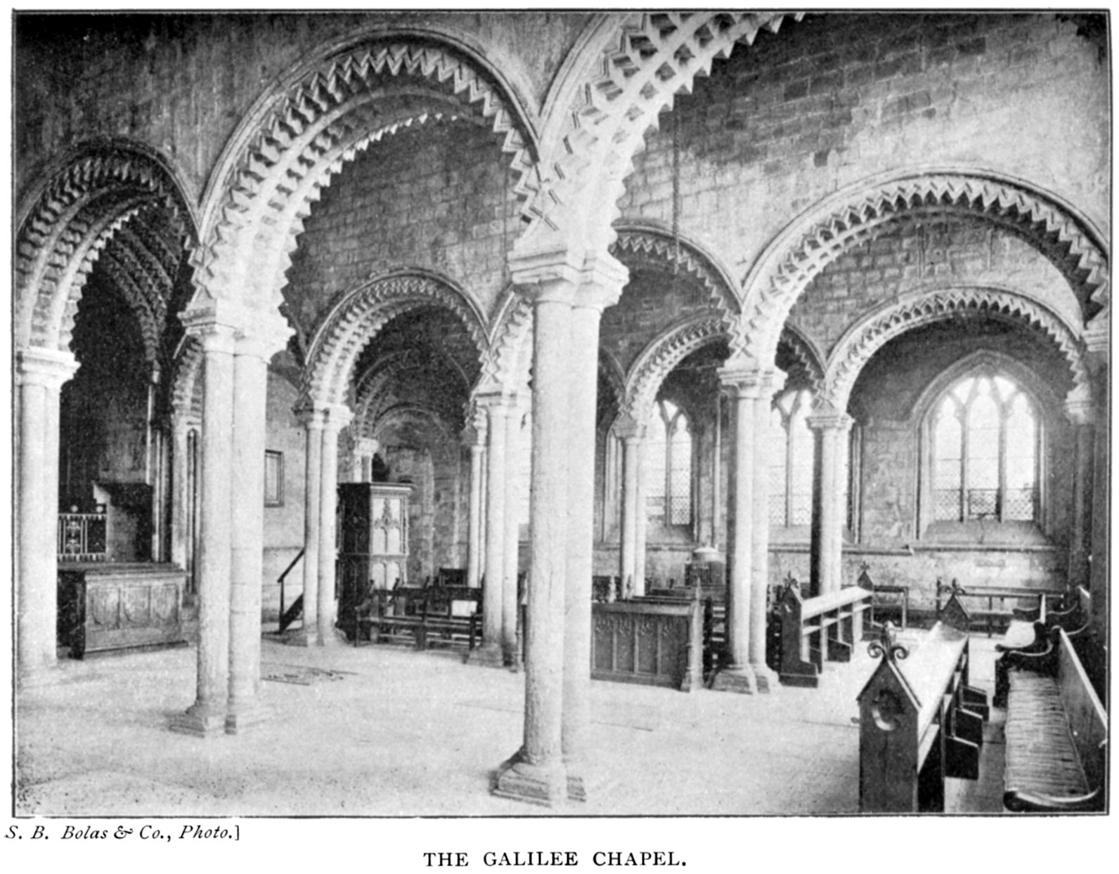 The West Front of Durham has, curiously enough, also lost its original character. The western doorway of the cathedral is hidden on the exterior by the Galilee or Lady Chapel, which was added by Pudsey in 1175. Above the Galilee roof is the large window inserted about the year 1346, while John Fossor was prior. The pointed arch of this window has over it, on the exterior, the original great semi-circular arch. Above this again, and between the two flanking western towers, is a small gable. The west end of the cathedral, when seen from the opposite side of the river, is extremely picturesque. The projecting mass of the Galilee, the western towers, the foreshortened nave roof, and the majestic central tower behind and above, form a group of high and rare excellence.
