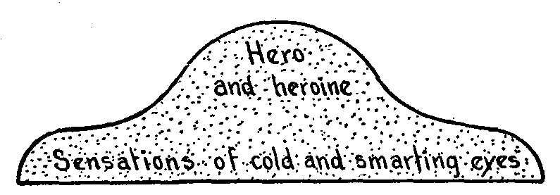 The Wave in the Stream of Consciousness.—The surface of our mental stream is not level, but is broken by a wave which stands above the rest; which is but another way of saying that some one thing is always more prominent in our thought than the rest. Only when we are in a sleepy reverie, or not thinking about much of anything, does the stream approximate a level. At all other times some one object occupies the highest point in our thought, to the more or less complete exclusion of other things which we might think about. A thousand and one objects are possible to our thought at any moment, but all except one thing occupy a secondary place, or are not present to our consciousness at all. They exist on the margin, or else are clear off the8 edge of consciousness, while the one thing occupies the center. We may be reading a fascinating book late at night in a cold room. The charm of the writer, the beauty of the heroine, or the bravery of the hero so occupies the mind that the weary eyes and chattering teeth are unnoticed. Consciousness has piled up in a high wave on the points of interest in the book, and the bodily sensations are for the moment on a much lower level. But let the book grow dull for a moment, and the make-up of the stream changes in a flash. Hero, heroine, or literary style no longer occupies the wave. They forfeit their place, the wave is taken by the bodily sensations, and we are conscious of the smarting eyes and shivering body, while these in turn give way to the next object which occupies the wave. Figs. 1-3 illustrate these changes.