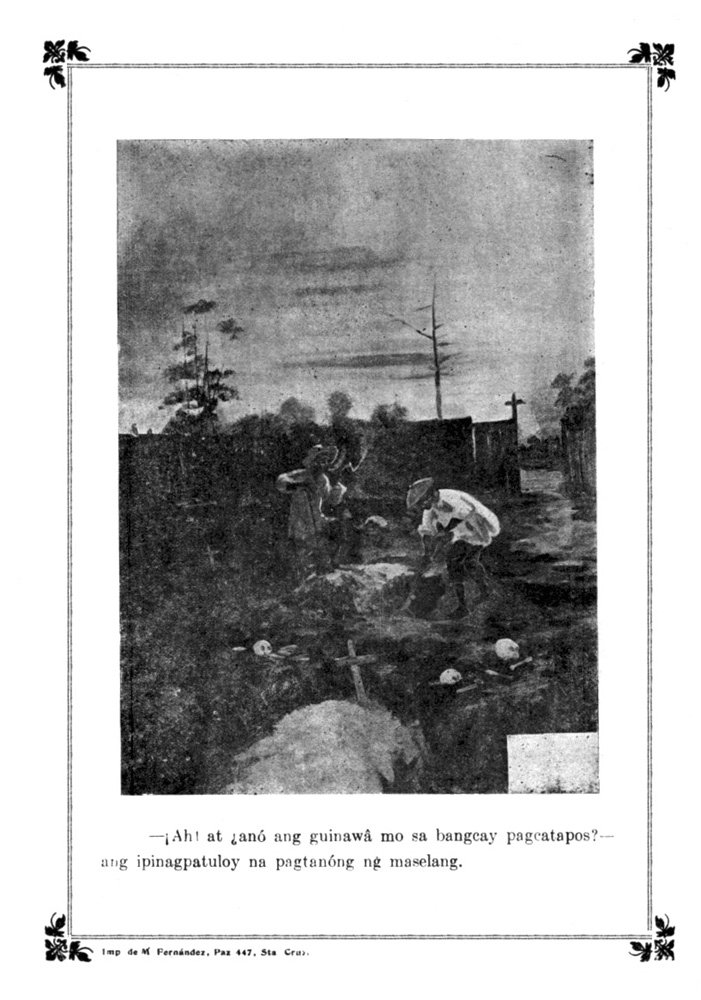 [217] Caraniwang tinatawag ng̃ catagalugan "tumbá", marahil sa túro ng̃ mg̃a fraile. Pinagpapatongpatong na mg̃a mesa ó balangcás na anó man, tinatacpan ng̃ damit na maitím at doon guinágawâ ang mg̃a ceremoniang ucol sa mg̃a patáy.