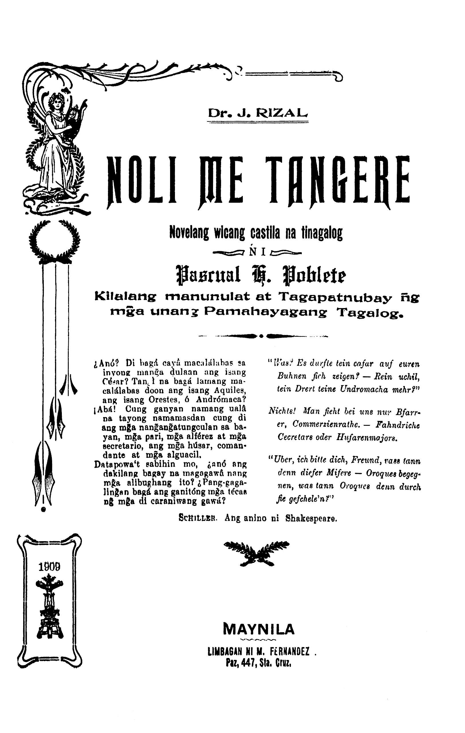 Sa hang̃ad na ang mg̃a librong NOLI ME TANGERE at FILIBUSTERISMO, na kinatha ng̃ Dr. Jose Rizal ay maunáwa at málasapang magaling ng̃ catagalugan, ang mg̃a doo'y sinasabing nagpapakilala ng̃ tunay nating calayaan at ng̃ dapat nating gawiin, at nacapagpapaálab, namán ng̃ ning̃as ng̃ ating puso sa pag-ibig sa kinamulatang lupa, minatapat cong ipalimbag ang isinawikang tagalog na mg̃a librong yaon, sa dahilang sa bilang na sampòng millong (sampong libong libo) filipino, humiguit cumulang, ay walang dalawampong libo ang tunay na nacatatalos ng̃ wicang castila na guinamit sa mg̃a kinathang yaón.