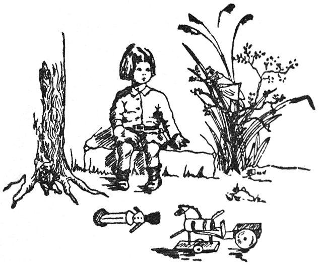 But he was not playing with his toys. He had laid his tin-soldier on the grass, though the little tin-soldier had been sleeping all morning and felt like a march. He had stood his horse-and-wagon in the shade, though the horse had been resting all morning and felt like a gallop. He had braced his Teddy Bear against a tree, though the Teddy Bear had been leaning against a chair all morning and felt like a romp. They all looked reproachfully at Billy, but he did not notice them. He seemed to be thinking deeply.