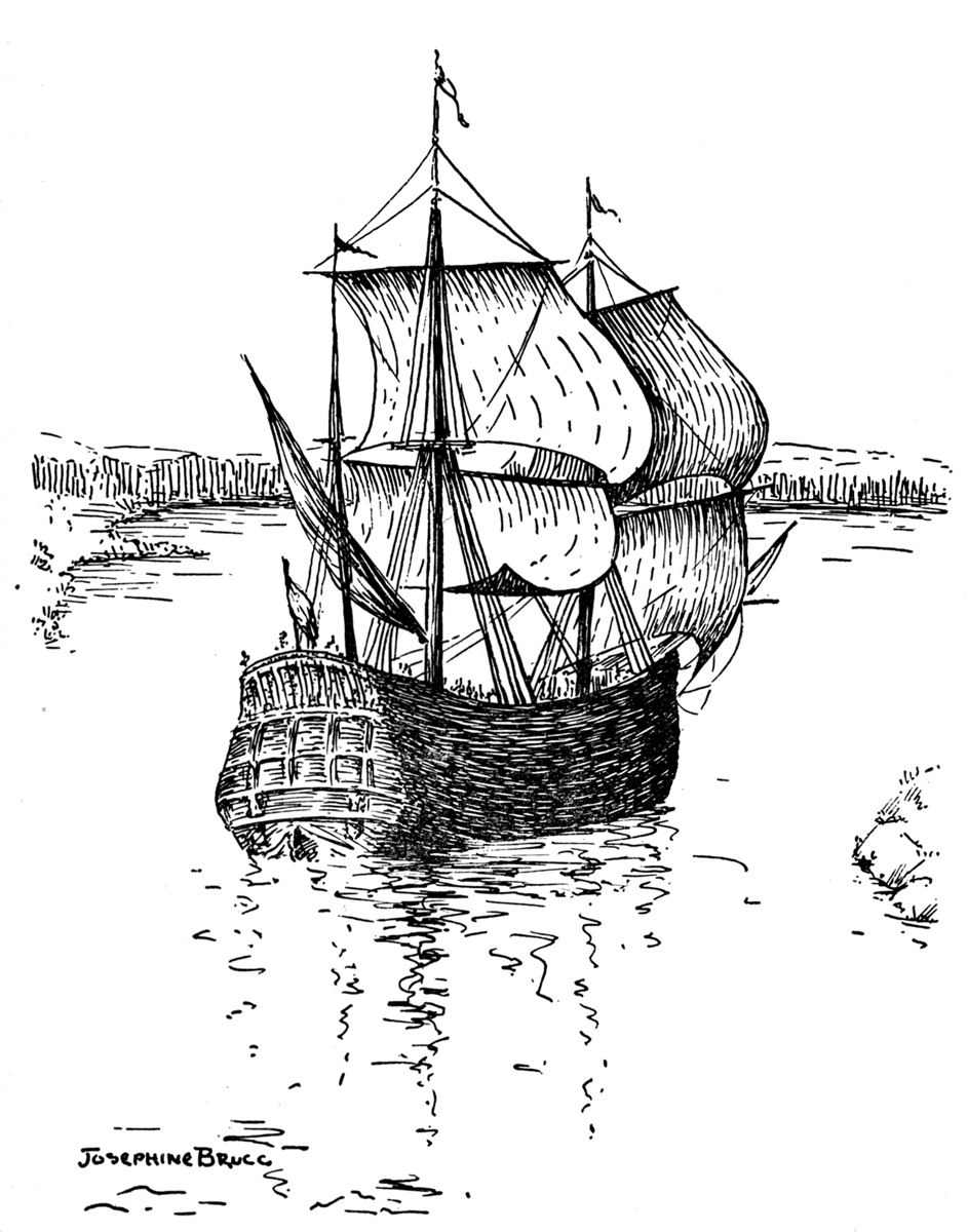 Suddenly he sat very straight, for there beyond the Narrows he saw a monstrous thing. Could it be a huge bird with white wings spread? [Pg 11]Over the water it seemed to be coming nearer. Instinctively he slid into a crevice between the rocks, yet without moving his gaze. Through the Narrows, under full sail, came the first ship. Nonowit seemed to become a part of the brown earth as he wriggled back into the undergrowth, never moving his wide-open eyes from this strange sight.