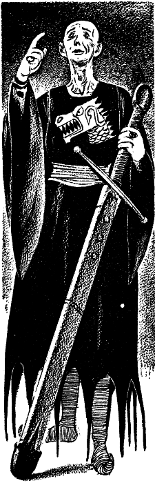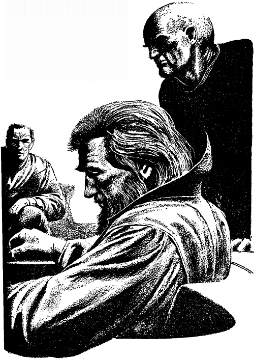 There were fourteen of them. They all wore ankle-length gowns, and they all had shaven heads. The one in the lead carried a staff and wore a pale green gown; he was apparently a herald. Behind him came two in white gowns, their empty hands folded on their breasts; one was a huge bulk of obesity with a bulging brow, protuberant eyes and a pursey little mouth, and the other was thin and cadaverous, with a skull-like, almost fleshless face. The ones behind, in dark green and pale blue, carried portfolios and slung sound-recorder cases. There was a metallic twinkle at each throat; as they approached, he could see that they all wore large silver gorgets. They came to a halt twenty feet from the desk. The herald raised his staff.