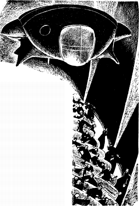 Then he saw Olvir Nikkolon stop short and thrust out his arm, pointing directly below the pickup, and as he watched, something green-gray, a remote-control contragravity lorry,[Pg 135] came floating into the field of the screen. One of the vehicles that had been sent down from the Empress Eulalie for use at the uranium mines. As it lifted and advanced toward the center of the room, the other Lords-Master were springing to their feet.