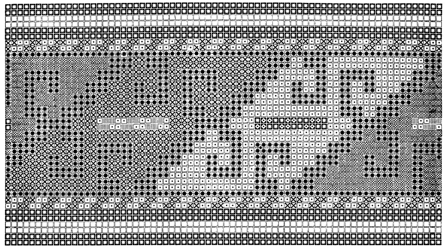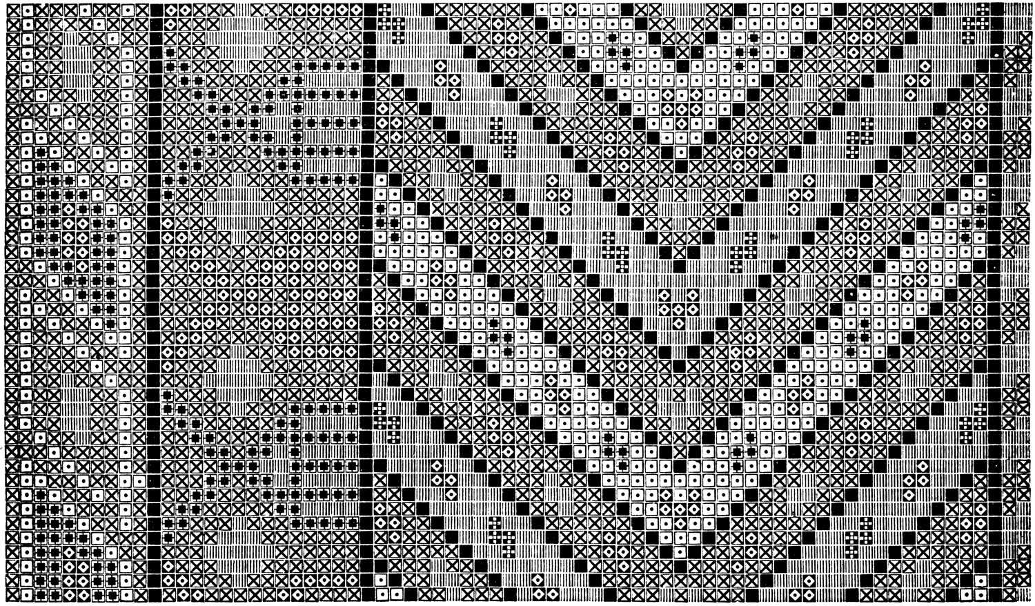 (3) Damask darning (figs. 44, 45, 46, 47, 48, 49).—A damask darn is begun in the same way as all other darns are; the pattern is formed by the cross-runnings and will vary with the number of warp threads taken up and missed, in each successive running. The woven design which you are to copy with your needle must therefore be carefully examined first.