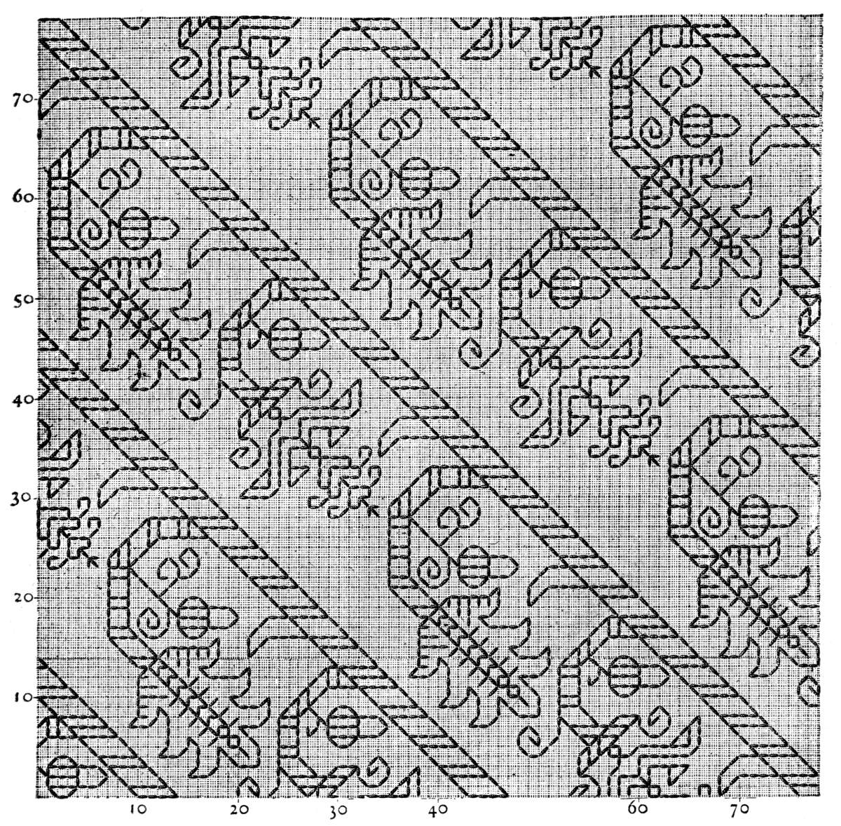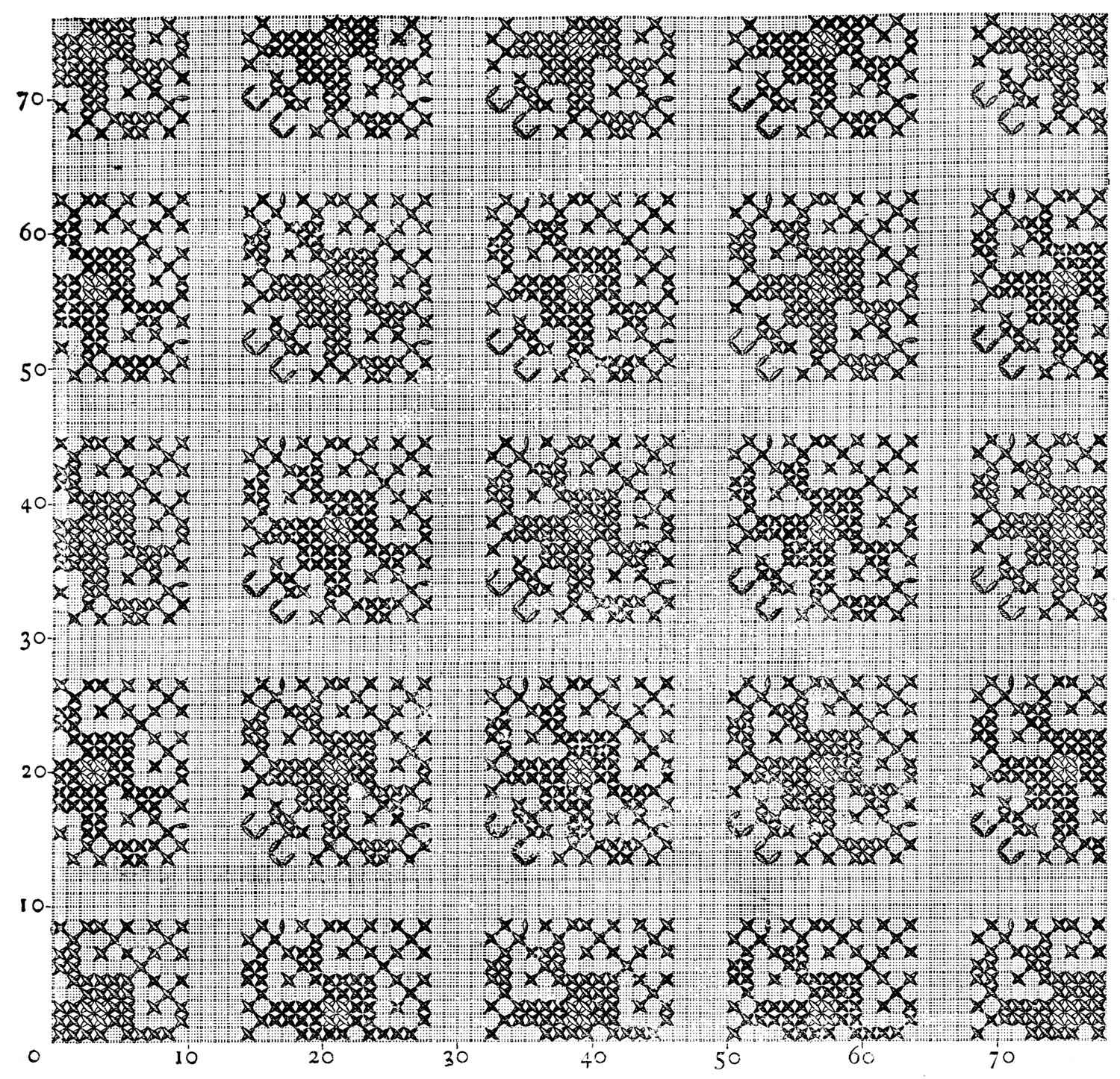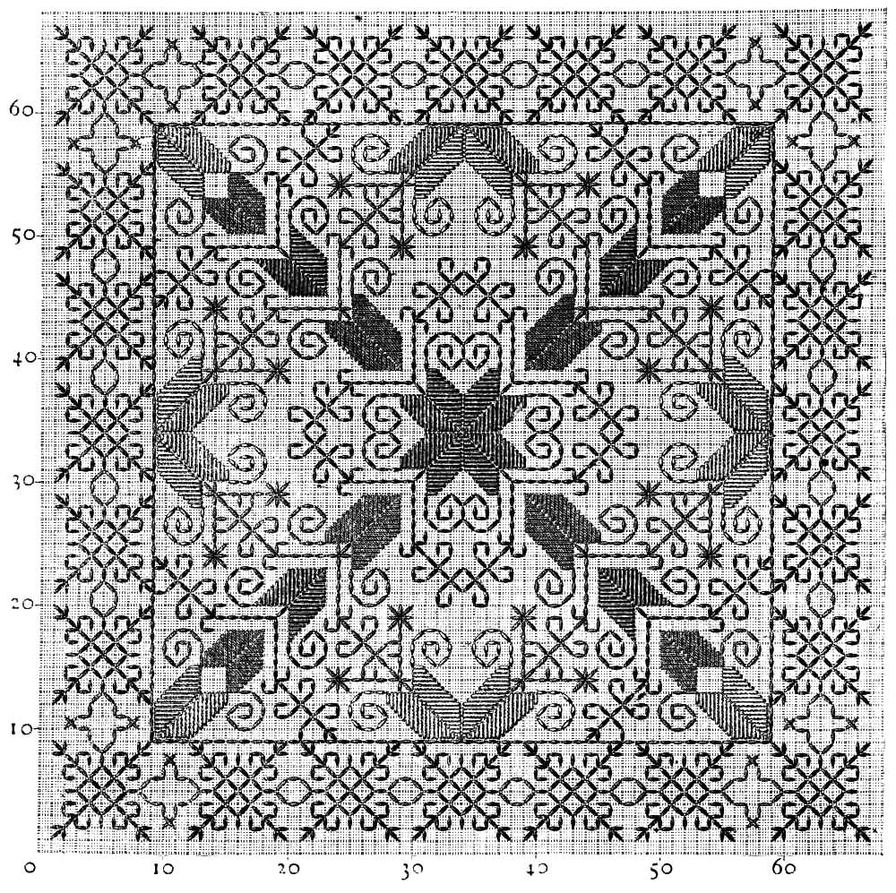 Fig. 49, which is executed in two colours, and is likewise copied from an old work on darning, shows you the manner in which a dice-pattern is to be reproduced.