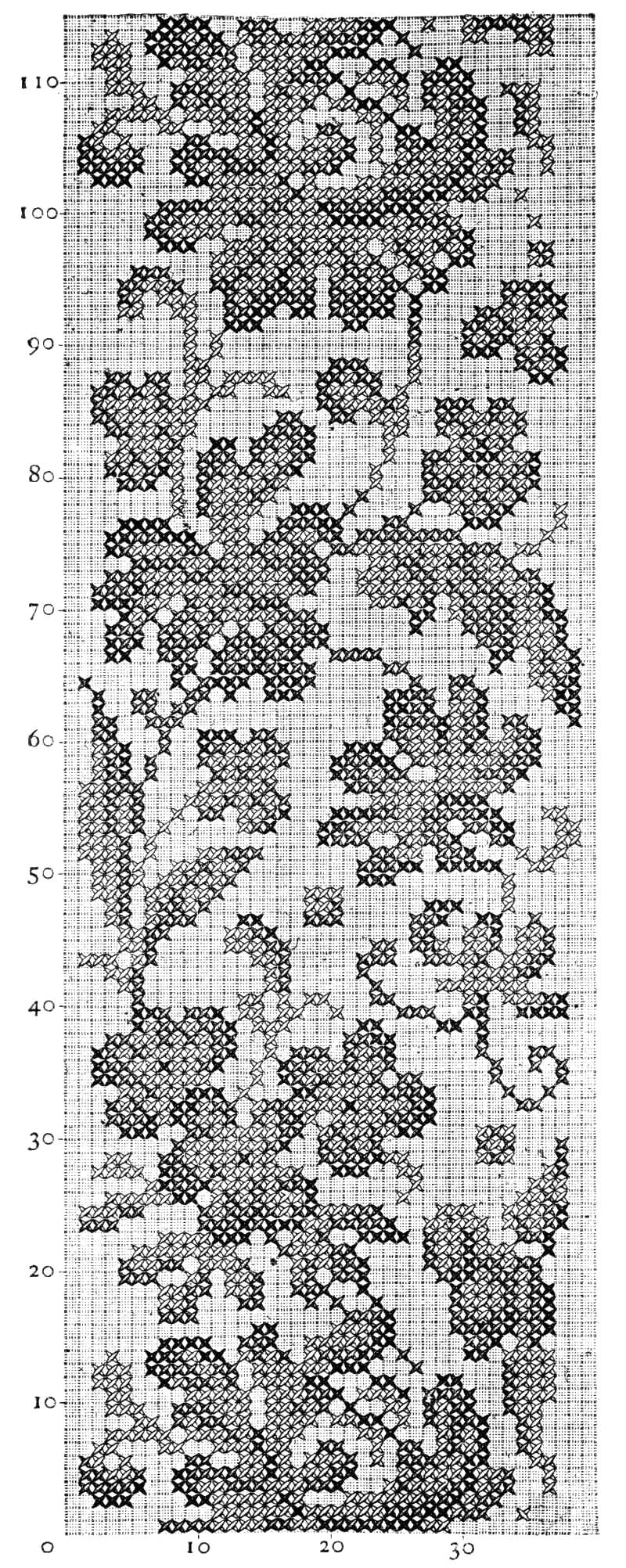 When the original is a coloured stuff, it is advisable to make a specimen darn first, on a larger scale, so that you may be more sure of obtaining a correct copy of the original web.