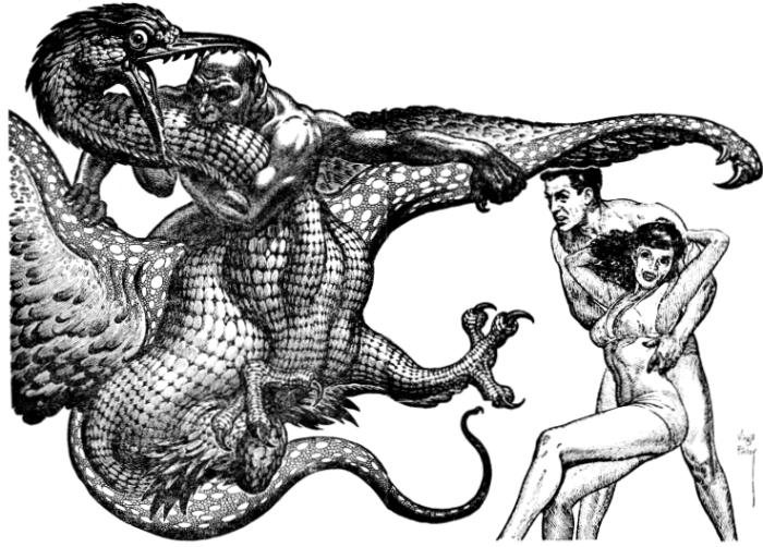 The guardian struggled to immobilize the beast's gigantic talons as the frightened girl leaped to the safety of Garlock's arms.