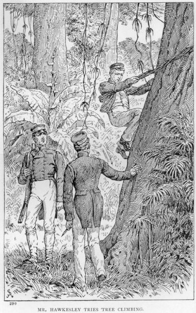Being there, it was only natural that Smellie and I should feel a strong desire to see once more the kind host and gentle hostess who had so generously nursed and entertained us in the time of our sore need. Leaving the boat at the head of the creek, therefore, in charge of the coxswain, with instructions to the latter to fire a couple of muskets in rapid succession should our presence be required, or, in the event of that being inadvisable, to make the best of his way along the footpath and up to the house, we set out—the bright flush on Smellie’s bronzed cheek, the joyous sparkle in his eyes, and the eager spring in his elastic footstep betraying plainly enough the pleasurable anticipations which occupied his mind.