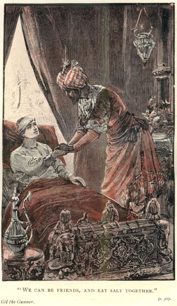 I was leaning against the wheel of the nearest gun, eating mechanically, and thinking that my father would be too late, for in the distance I could see sepoys gathering and marching forward as if for another assault, when a lady approached me with a cup and a vessel of water.