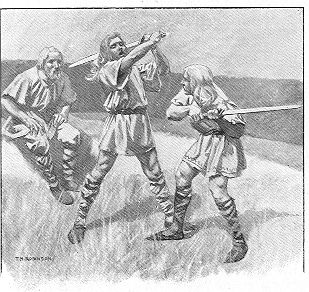 They all loved to be out in the open air along with Cerda, the Saxon jarl, one of the King’s chief fighting-men, who urged them to learn how to use the broadsword. After setting one of the men to make swords for the boys—not of hard cutting steel, but of good tough ash-wood—and then matching them two against two, he would sit and roar with laughter at the blows they gave and took.