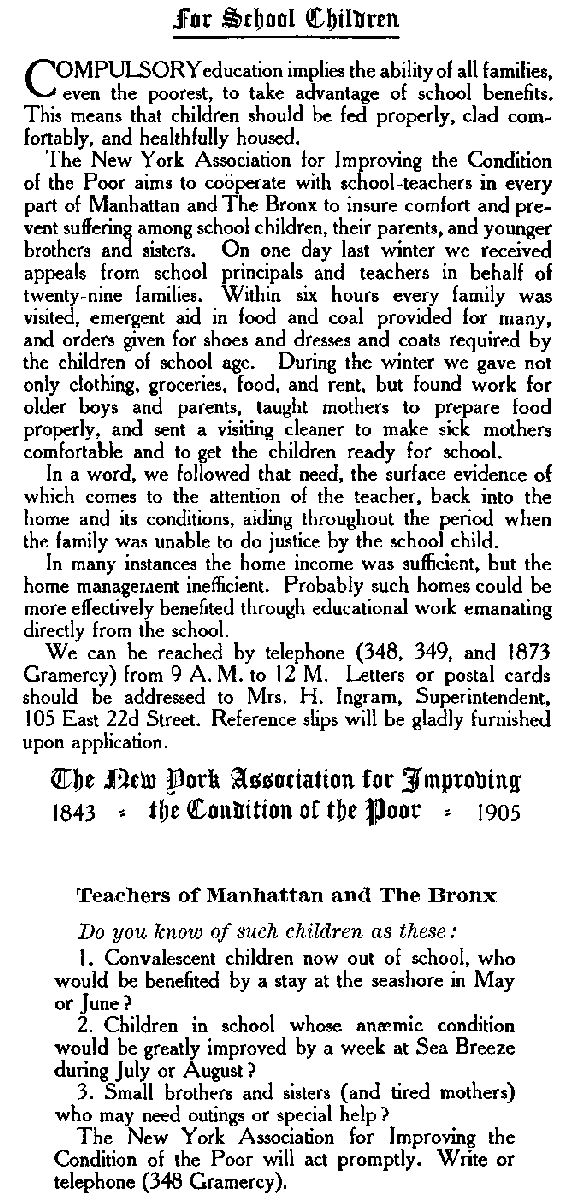 Most of us know what uphill work it is to live hygienically in an unhygienic environment. I remember how hard it was to eat happily when sitting beside a college professor who took brown pills before each meal, yellow pills between each course, and a dose of black medicine after the meal was over. Mariano, an Italian lad cured of bone tuberculosis by out-of-door salt air at Sea Breeze, returned to his tenement home an ardent apostle of fresh air day and night, winter and summer. His family allowed him to open the window before going to bed, but closed it as soon as he was asleep. Lawrence Veiller, our greatest expert on tenement conditions, says: "To bathe in a tenement where a family of six occupy three rooms often involves the sacrifice of privacy and decency, which are quite as important to social betterment as cleanliness."