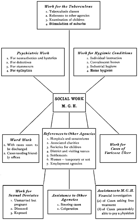 Many alcoholics have for months given evidences of complete cure. Stories almost incredible are quickening pastor and physician alike throughout the country. After individual treatments are given, after religious motive is appealed to, and the soul stirred to heed the lessons of religion, medicine, and sociology, patients are given the work cure. Thus a branch of social service is established, where after-treatment is given to the patient whose thoughts have been turned from himself to others. All of a sudden the church finds itself in need of definite knowledge as to opportunities for altruistic work, as to definite community needs not met, as to people in distress who can be relieved by volunteers, as to agencies which can be called upon to coöperate both in treating the individual and in utilizing his energies for others' benefits.