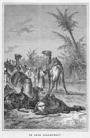 I was very willing to take advantage of Ben’s suggestion; so giving my horses into his keeping, I took his camel and led it up in front of Siddy Boo Cassem’s tent, where, making it lie down, I threw myself on the ground near it. Its owner and several friends were seated, as Ben expected,—the hoods of their burnouses, drawn over their heads, making them look more like a party of old crones than stalwart Arabs habituated to war and the chase; or I might have taken them for the witches in “Macbeth” discussing their malevolent designs. On one side were the ruined walls of the Roman town, with a tall monument rising above them; in front were the tents, spread beneath a few sparsely scattered palm-trees; while beyond could be seen the boundless Desert, the crescent moon casting a pale light over the scene.