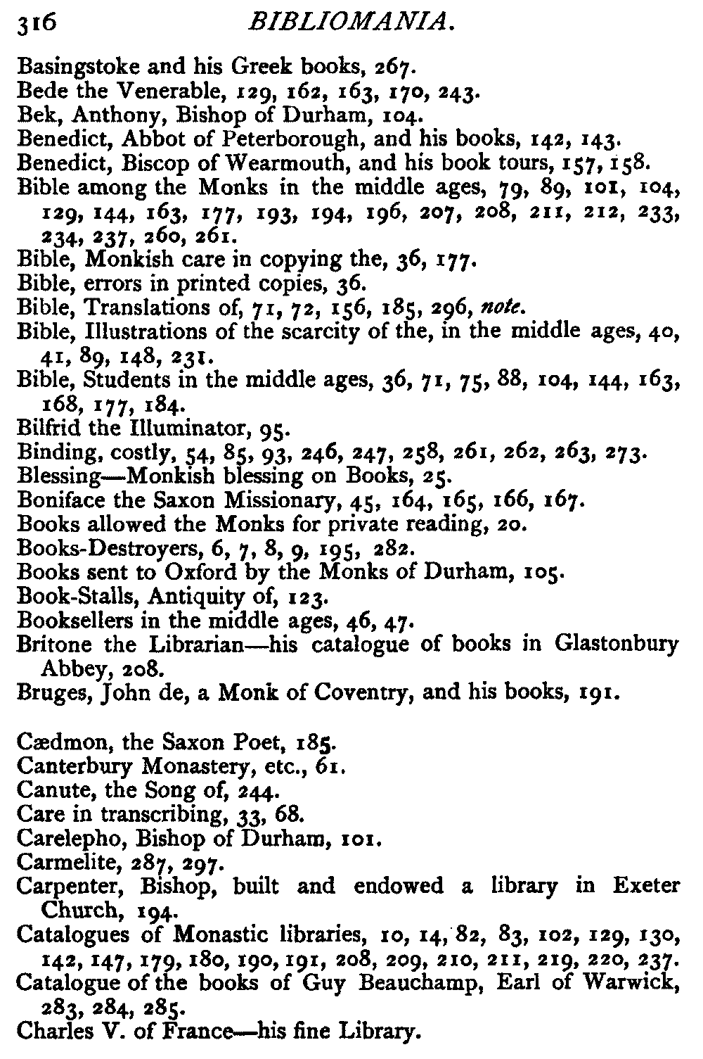 But, leaving these things, I have only to deal with such remains as relate to the love of books in those times. I would show the means then in existence of acquiring knowledge, the scarcity or plentitude of books, the extent of their libraries, and the rules regulating them; and bring forward those facts which tend to display the general routine of a literary monk, or the prevalence of Bibliomania in those days.