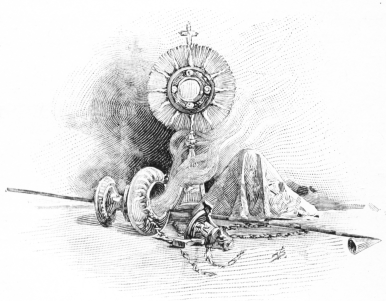 Elle appartient aux Rédemptoristes, ordre féminin, fondé au dernier siècle par la marquise de Saint-Yvert-Leroy. Ces religieuses, toutes recrutées parmi les riches du monde, ne soignent point de malades, ne visitent point les pauvres. Elles enseignent un petit nombre d'élèves, choisies comme elles-mêmes dans la société; mais leur fondatrice leur a principalement destiné le rôle de Marie en la maison de Lazare: l'adoration aux pieds du Maître divin. Sur l'autel miroitant d'émeraudes,—telle la châsse des rois mages à Cologne,—le cercle pâle de l'hostie luit perpétuellement parmi les rayons de l'ostensoir. Elles, les Rédemptoristes, le corps chastement chemisé de blanc, un manteau de velours bleu, ceint d'or, les revêt en face de l'Époux: et remplacées par d'autres lorsque la fatigue les épuise, elles demeurent deux par deux agenouillées en muette prière devant le tabernacle illuminé.