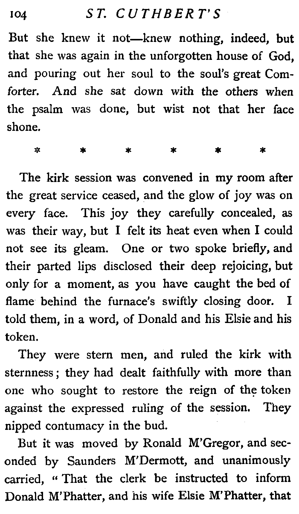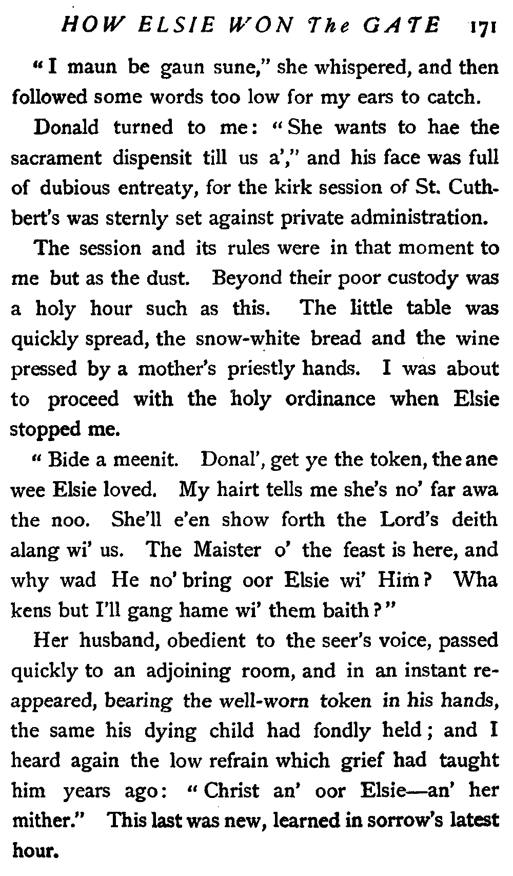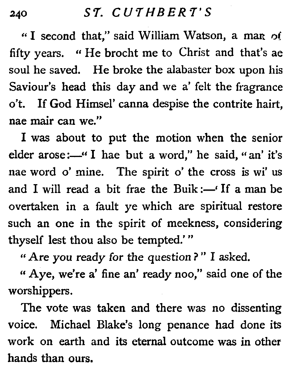 "Let us have our unbroken number," I began; "the kirk session is constituted, and I call upon such as have been chosen to serve within it, to come forward and assume the holy office. After this, the sacrament of forgiving love will be dispensed."