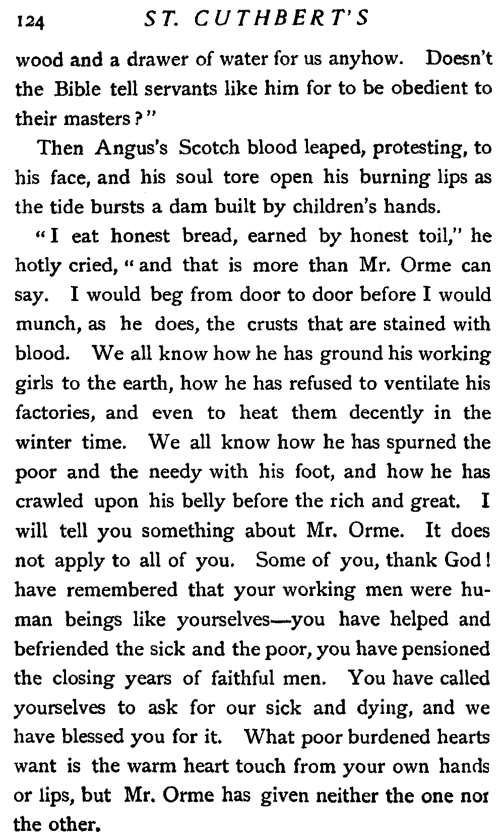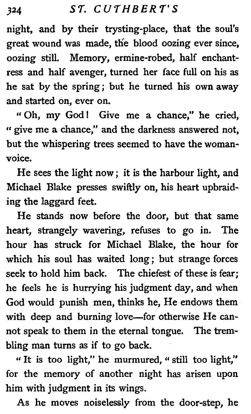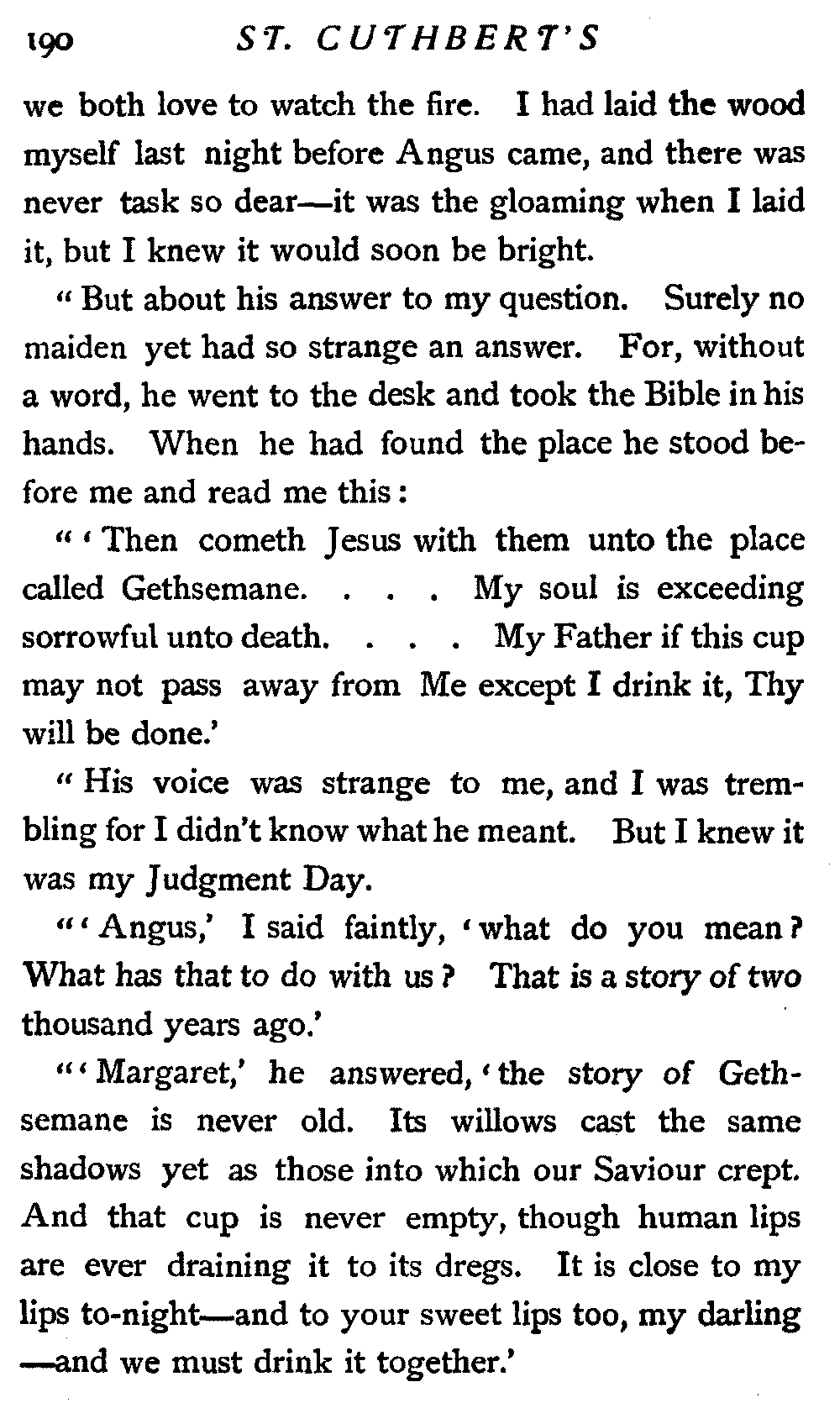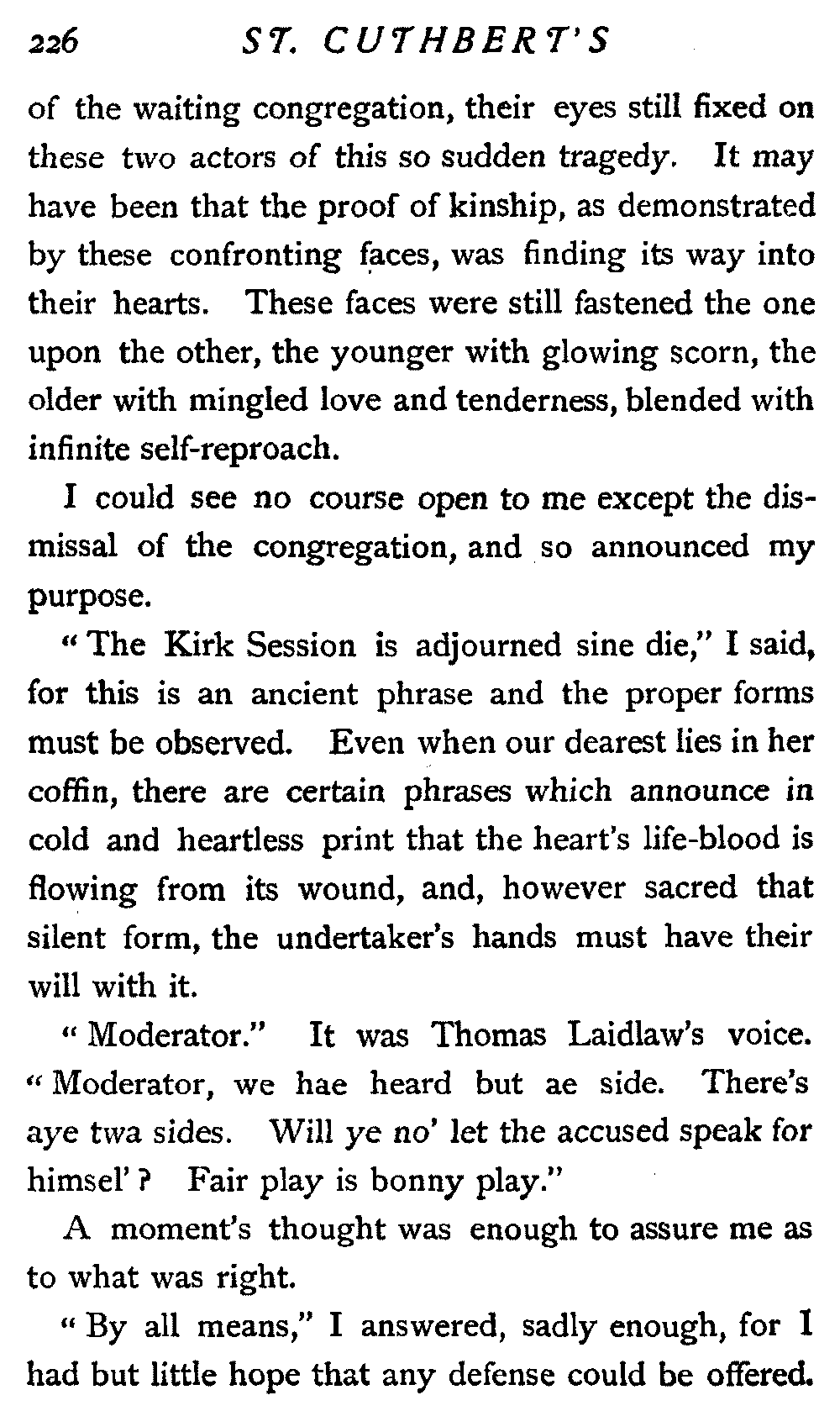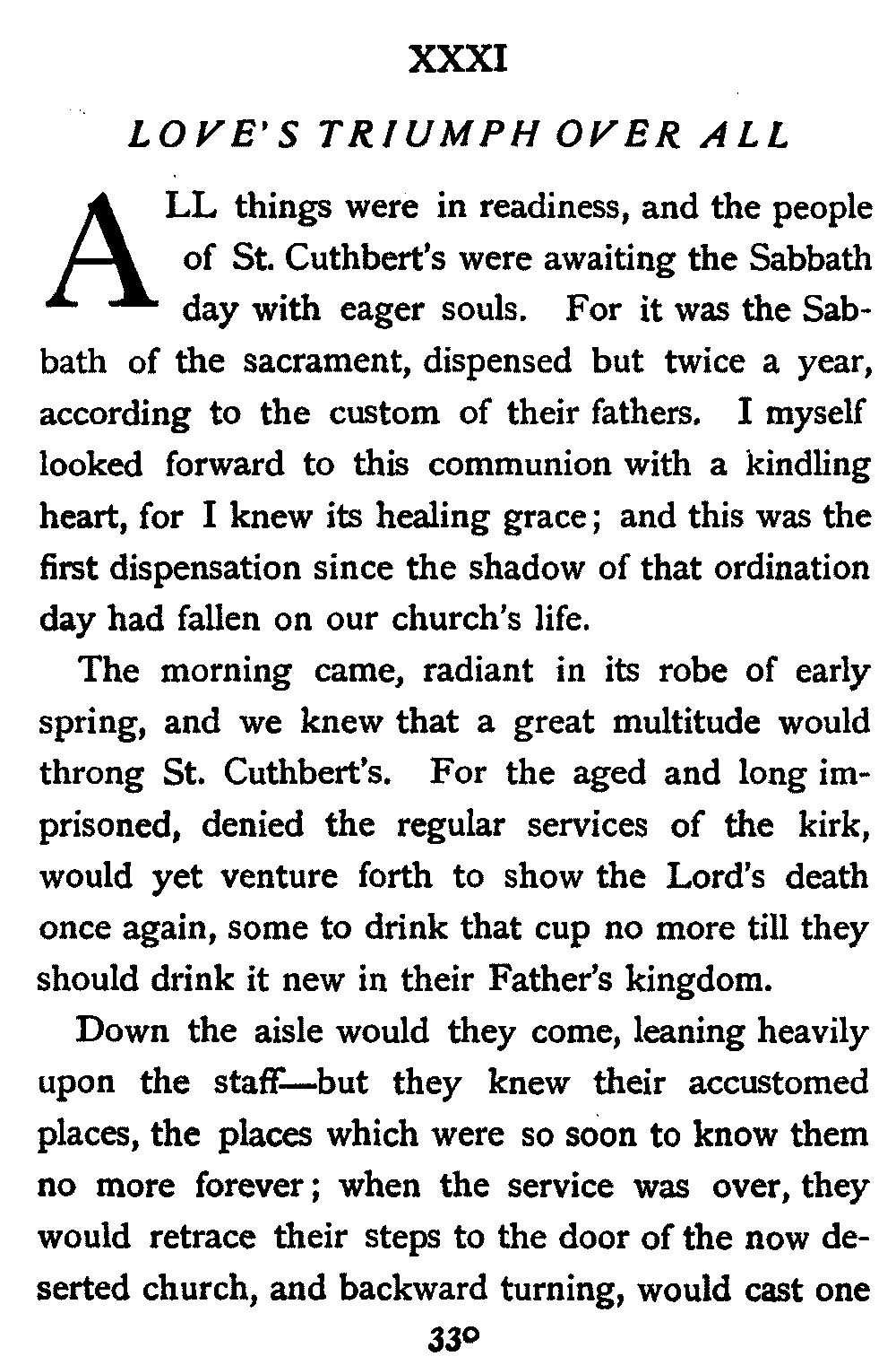 All things were in readiness, and the people of St. Cuthbert's were awaiting the Sabbath day with eager souls. For it was the Sabbath of the sacrament, dispensed but twice a year, according to the custom of their fathers. I myself looked forward to this communion with a kindling heart, for I knew its healing grace; and this was the first dispensation since the shadow of that ordination day had fallen on our church's life.