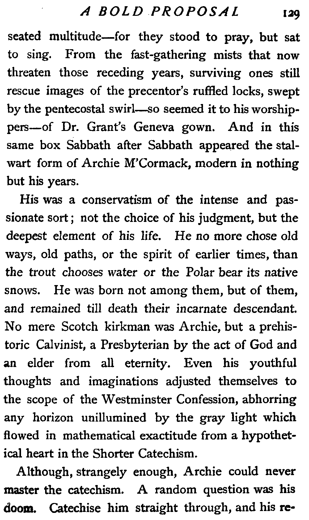 I now saw that this was no diluted Scotsman. Bred on Canadian soil, he was yet original and pure. He had struck the native Scottish note, the ecclesias[16]tical. Like all his countrymen, he had a native taste for a minister. His instincts were towards the Kirk, and for all things akin to Psalm or Presbytery he intuitively took the scent. I have maintained to this day that he sniffed my sermons from afar, undeceived by the worldly flavour of my rusty bag.
