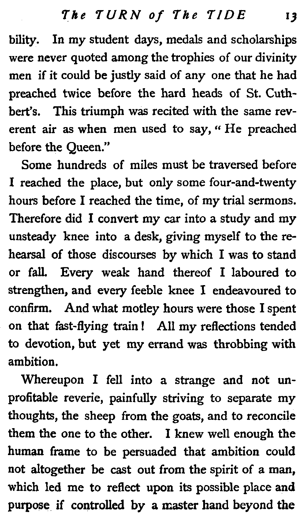 Some hundreds of miles must be traversed before I reached the place, but only some four-and-twenty hours before I reached the time, of my trial sermons. Therefore did I convert my car into a study and my unsteady knee into a desk, giving myself to the rehearsal of those discourses by which I was to stand or fall. Every weak hand thereof I laboured to strengthen, and every feeble knee I endeavoured to confirm. And what motley hours were those I spent on that fast-flying train! All my reflections tended to devotion, but yet my errand was throbbing with ambition.