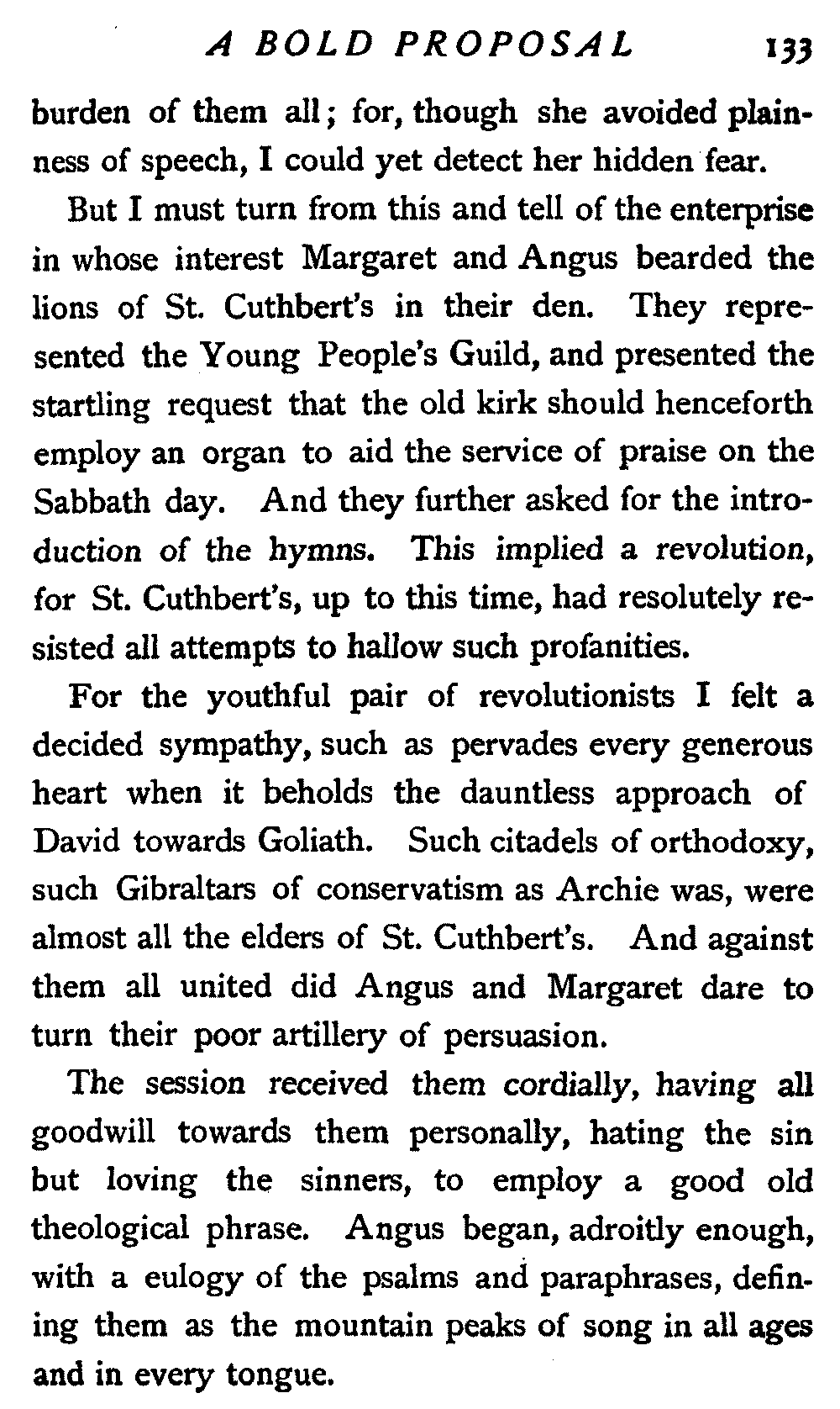I hurriedly commended his reference to the Scriptures, at the same time avoiding any share in his[18] rather significant classification, remarking on the other hand that elders had their place, and that authority was indispensable in all churches, and the very essence of the Presbyterian system.