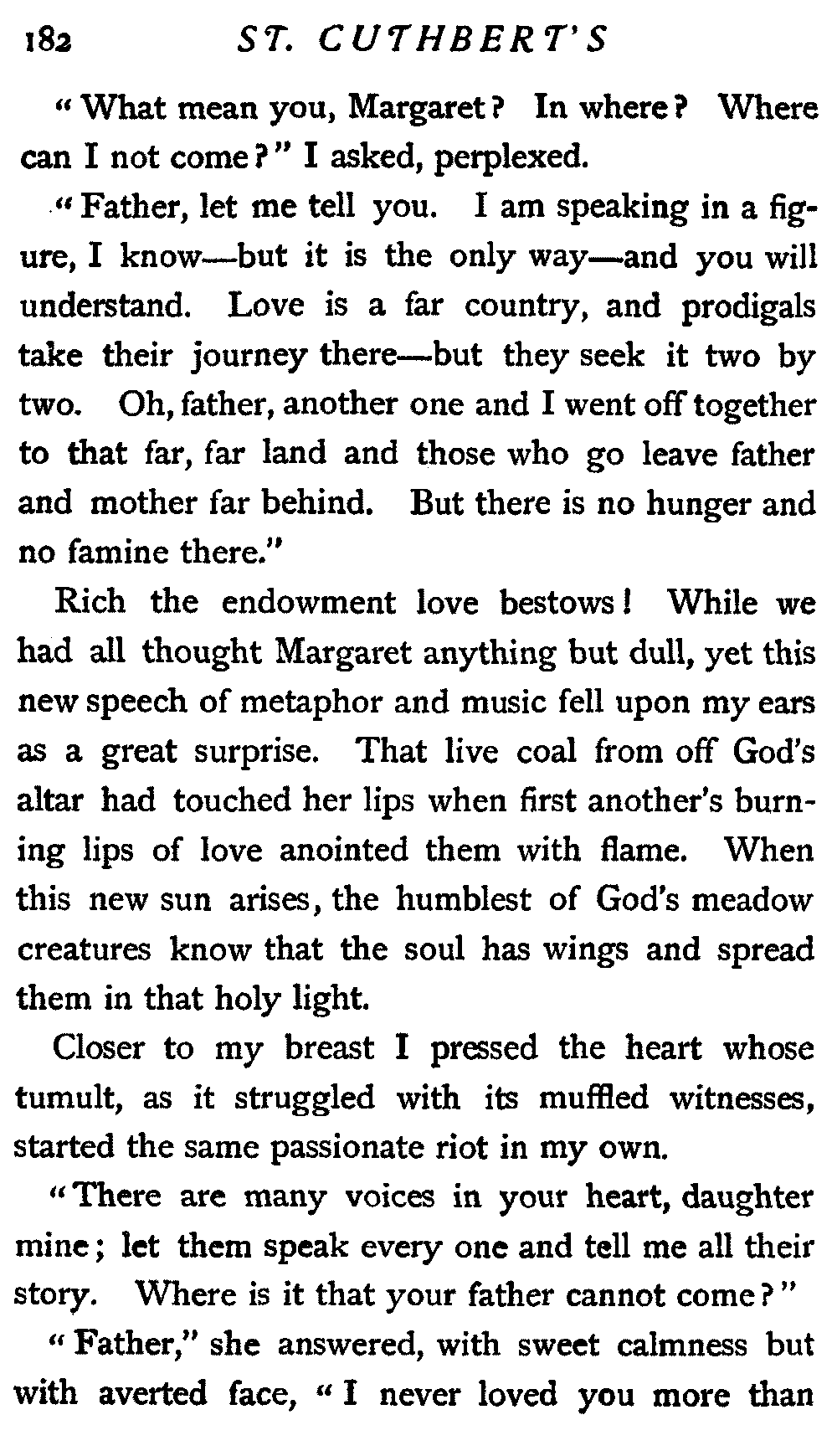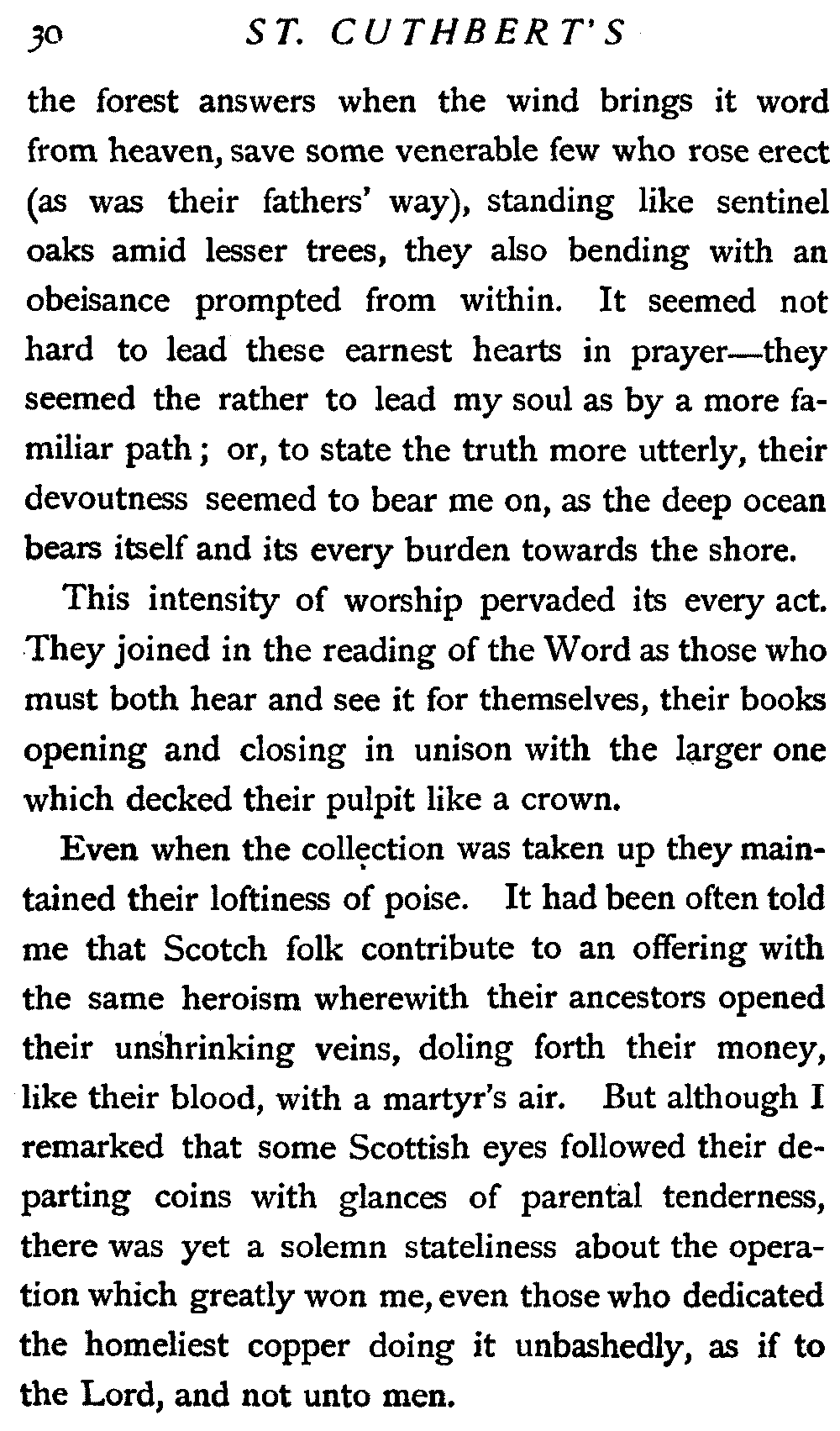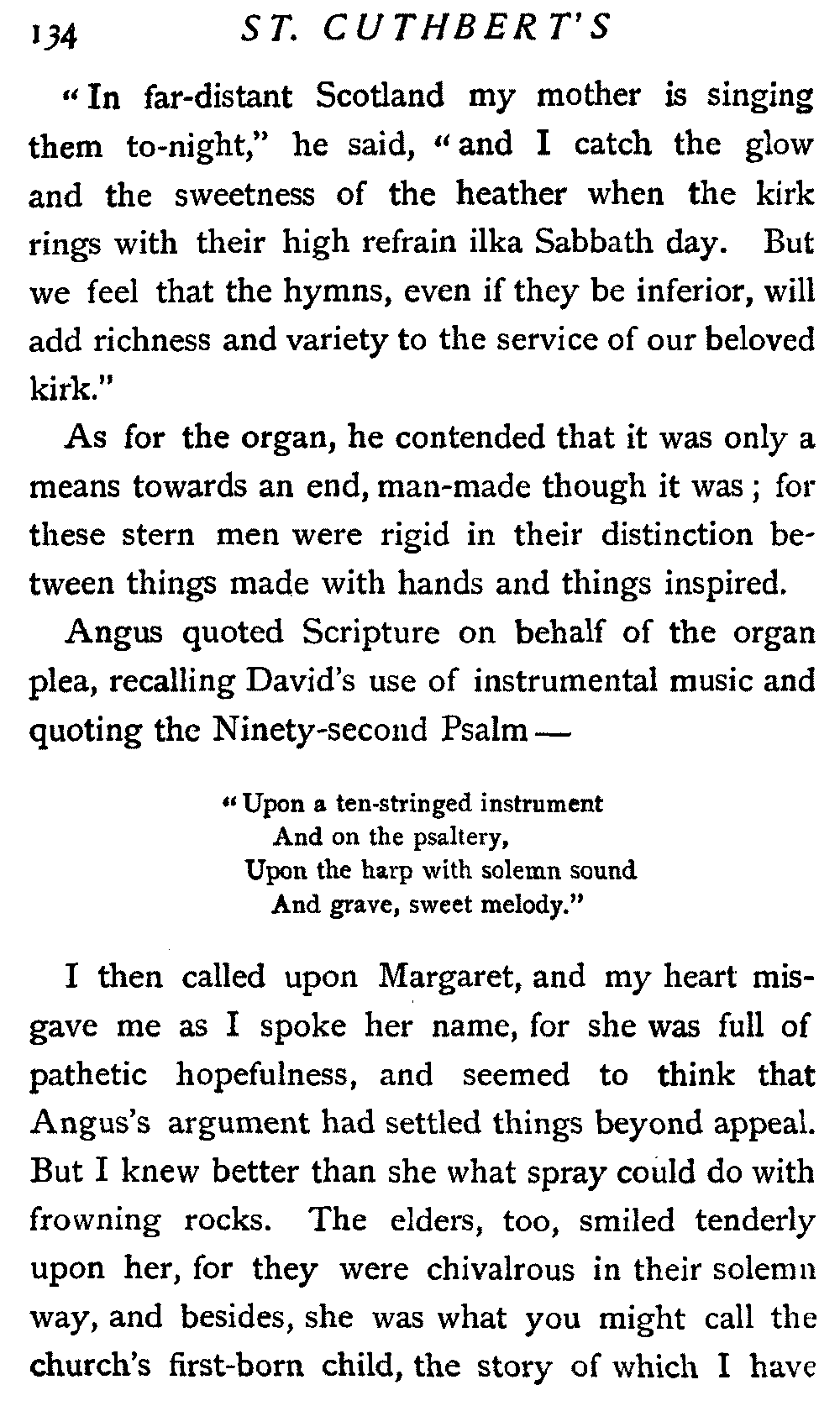 Therefore my lips were almost dumb, but my heart joined in the swelling praise that rolled about St. Cuthbert's like a flood. And I heard one voice clear and sweet among all the rest; it came from the pew where sat our Margaret, but it was not Margaret's voice: