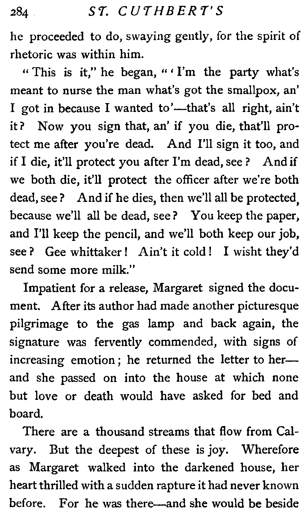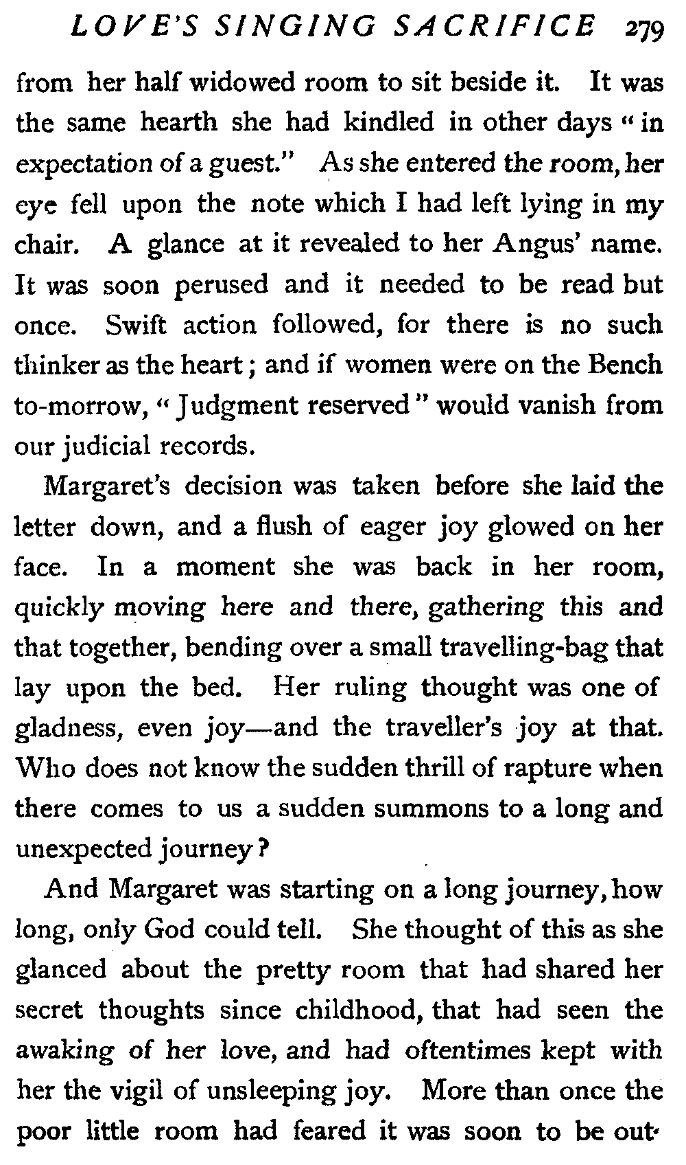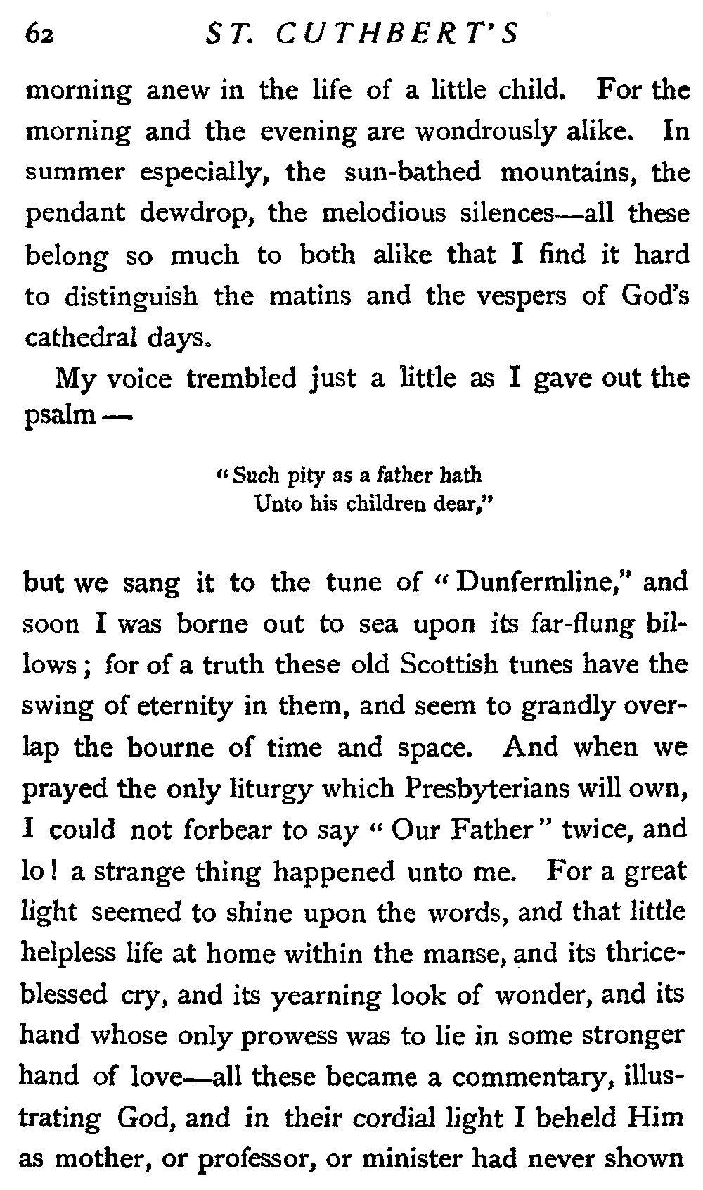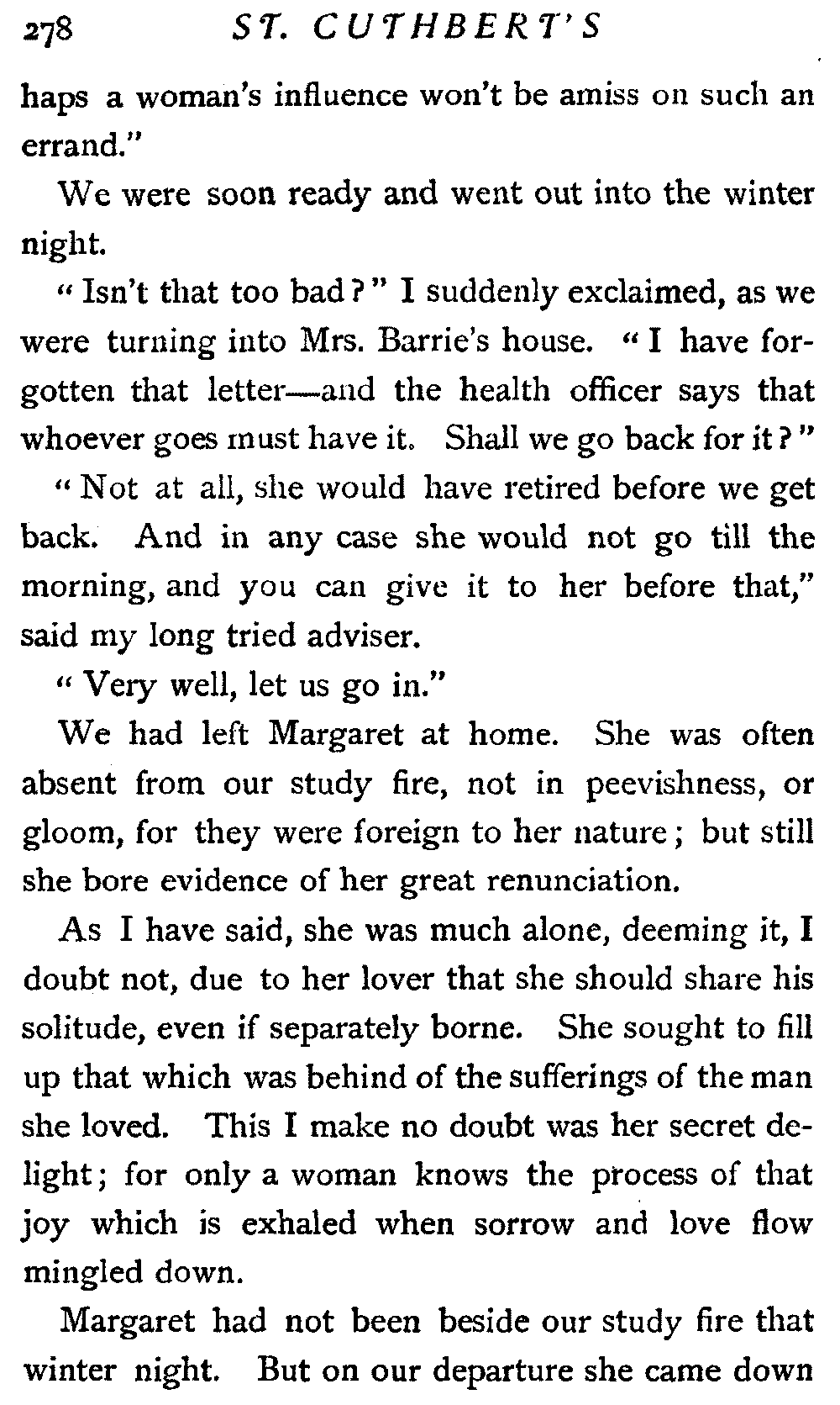 Therefore my lips were almost dumb, but my heart joined in the swelling praise that rolled about St. Cuthbert's like a flood. And I heard one voice clear and sweet among all the rest; it came from the pew where sat our Margaret, but it was not Margaret's voice: