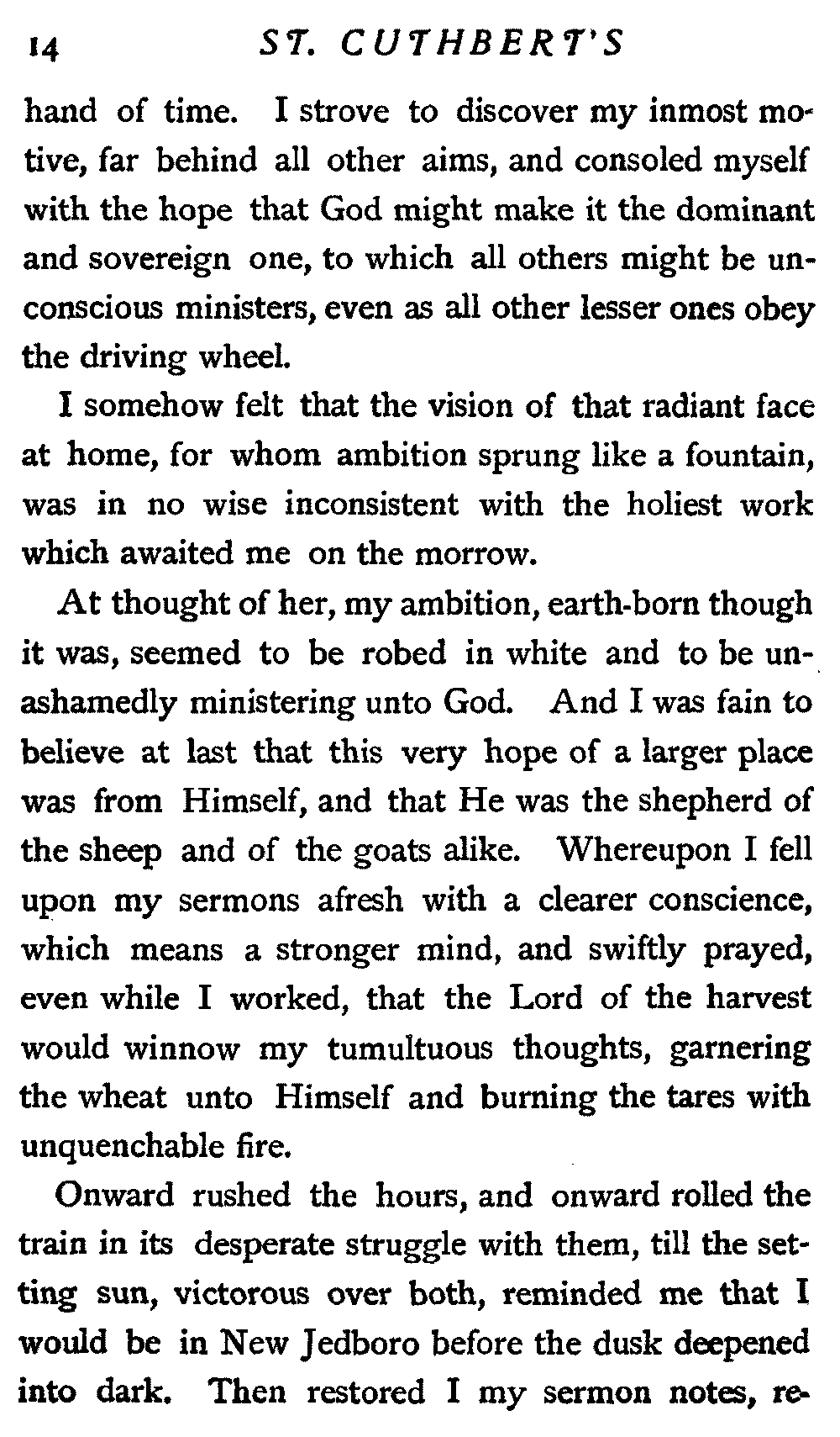 Onward rushed the hours, and onward rolled the train in its desperate struggle with them, till the setting sun, victorious over both, reminded me that I would be in New Jedboro before the dusk deepened into dark. Then restored I my sermon notes, re[15]burnished and repaired, to the trusty keeping of my well-worn valise, settling myself for one of those delicious baths of thought to be truly enjoyed only on the farther side of toil.