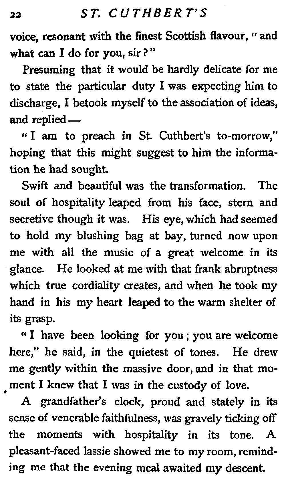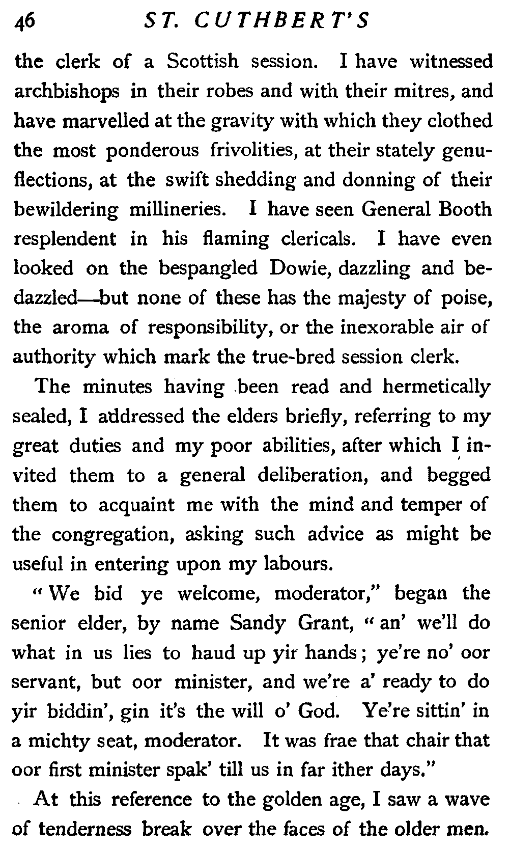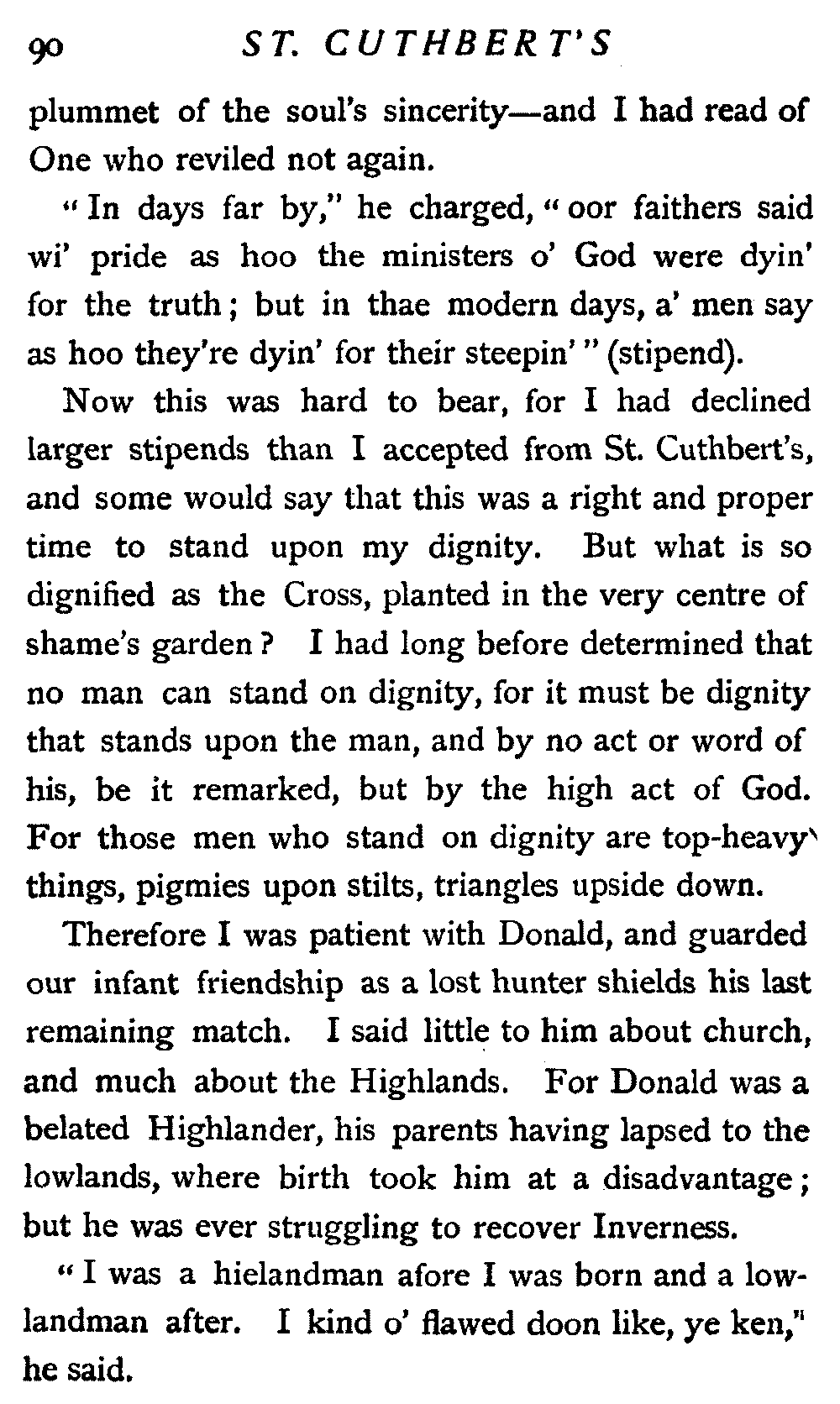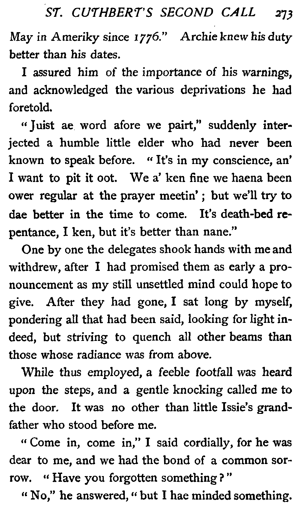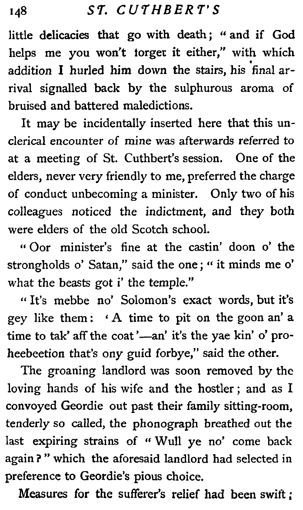 His next interrogation was launched with courteous composure: "Ye'll no' be the man wha's expeckit in St. Cuthbert's ower the Sabbath?"