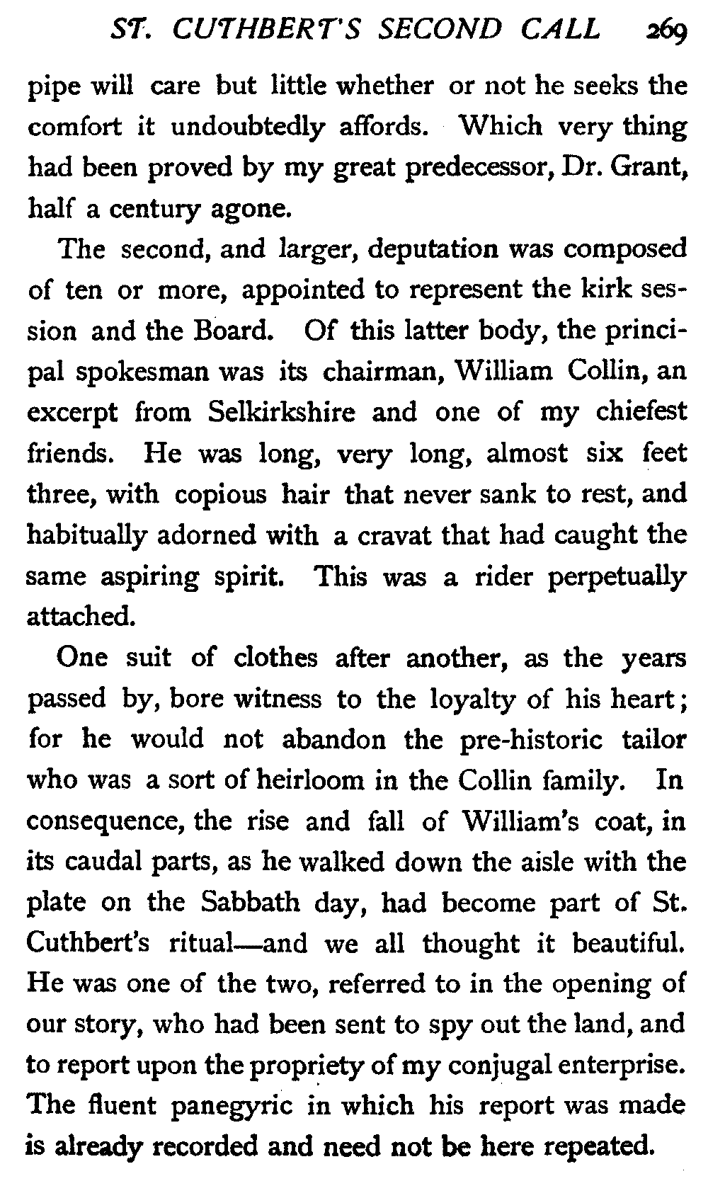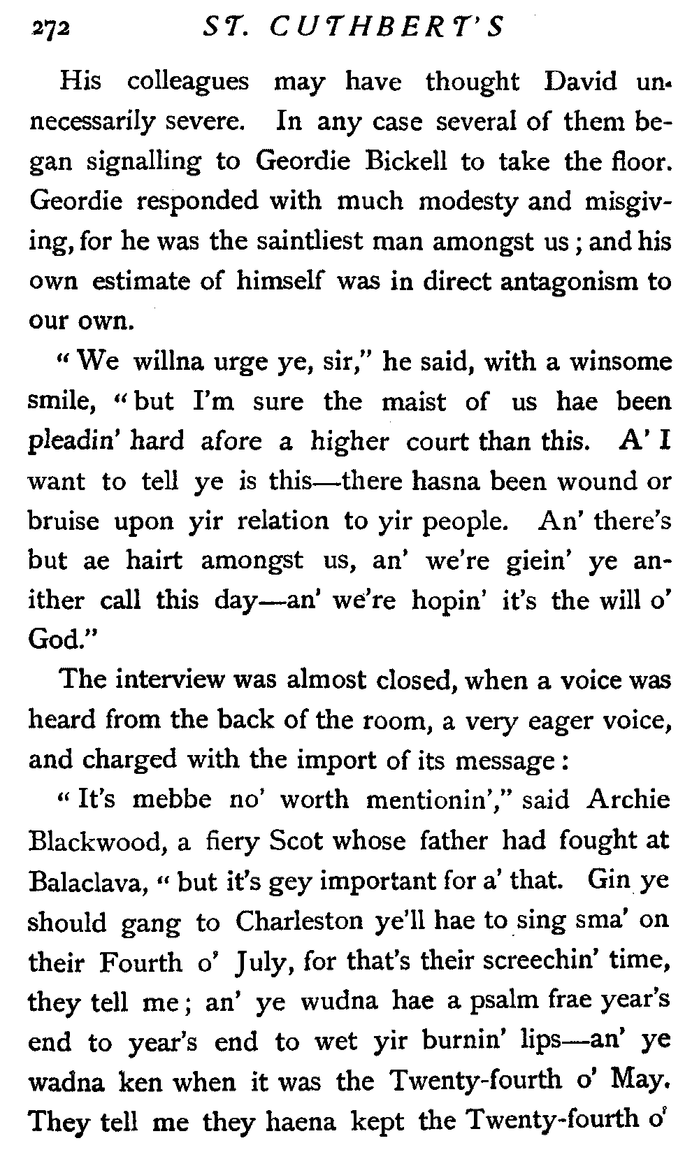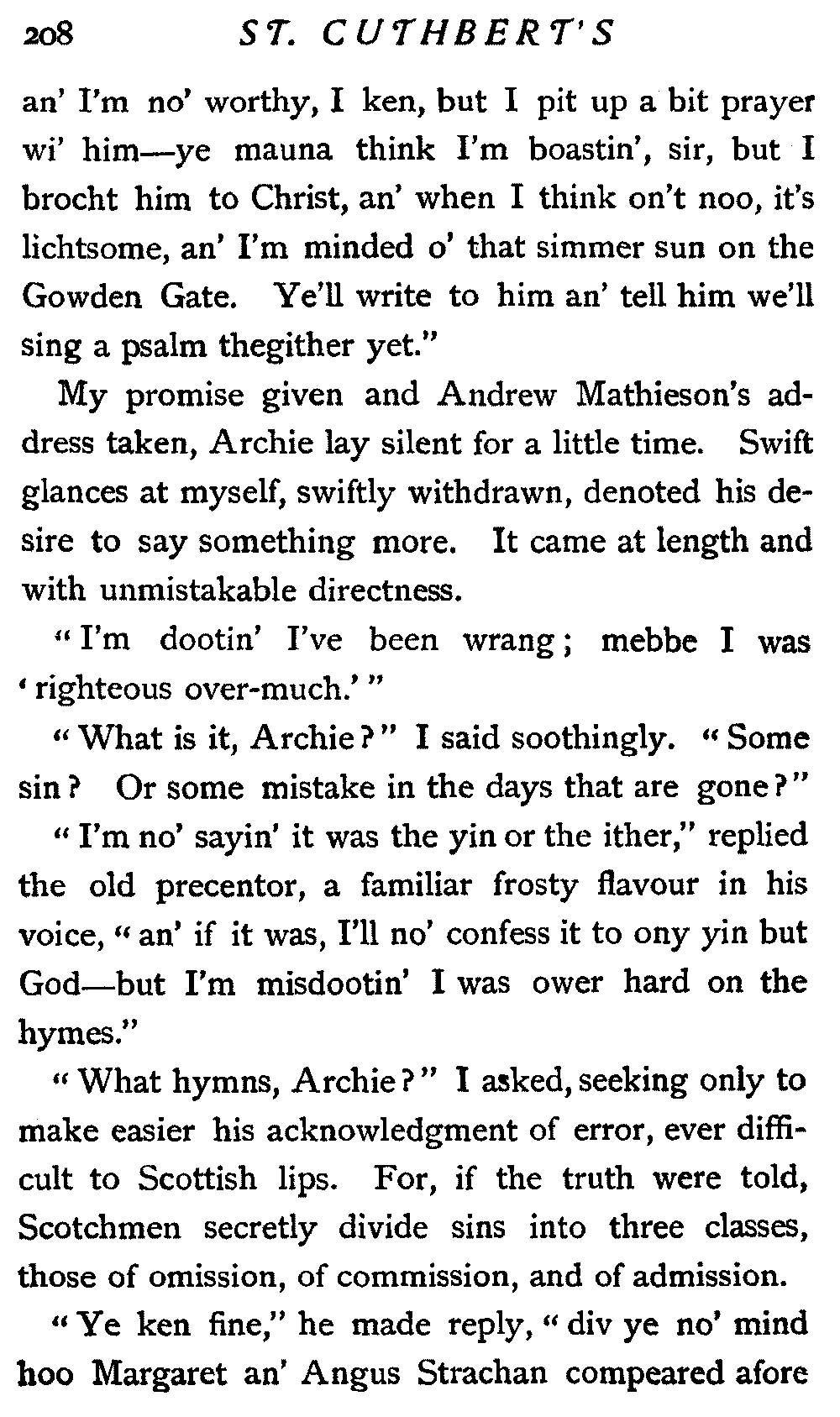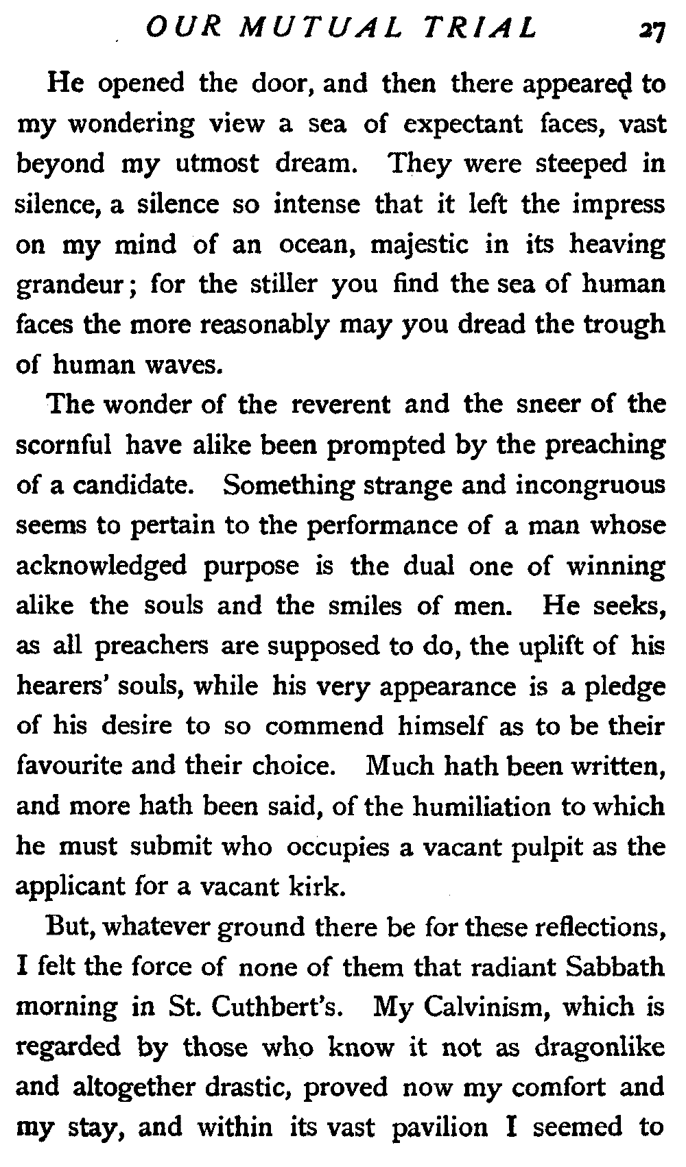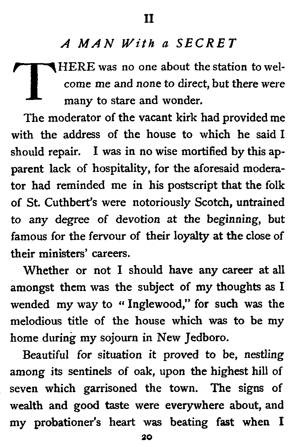 His next interrogation was launched with courteous composure: "Ye'll no' be the man wha's expeckit in St. Cuthbert's ower the Sabbath?"
