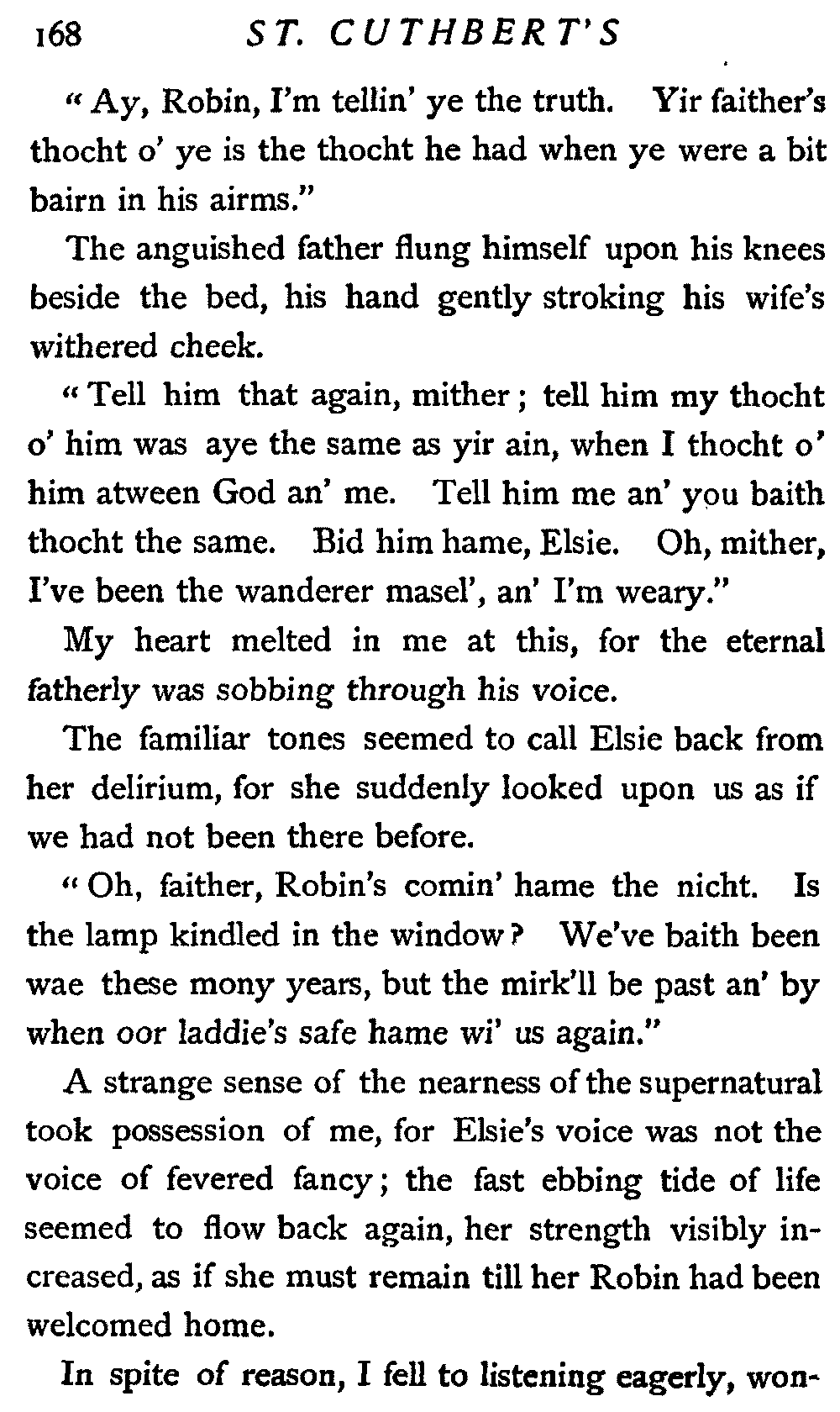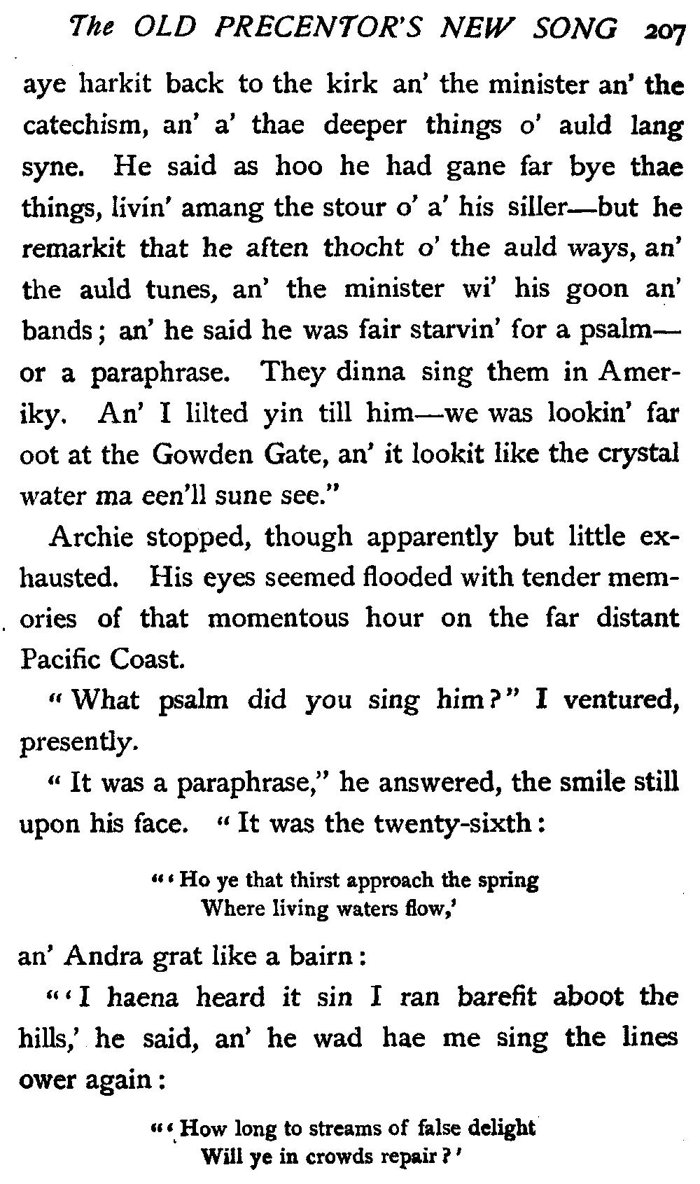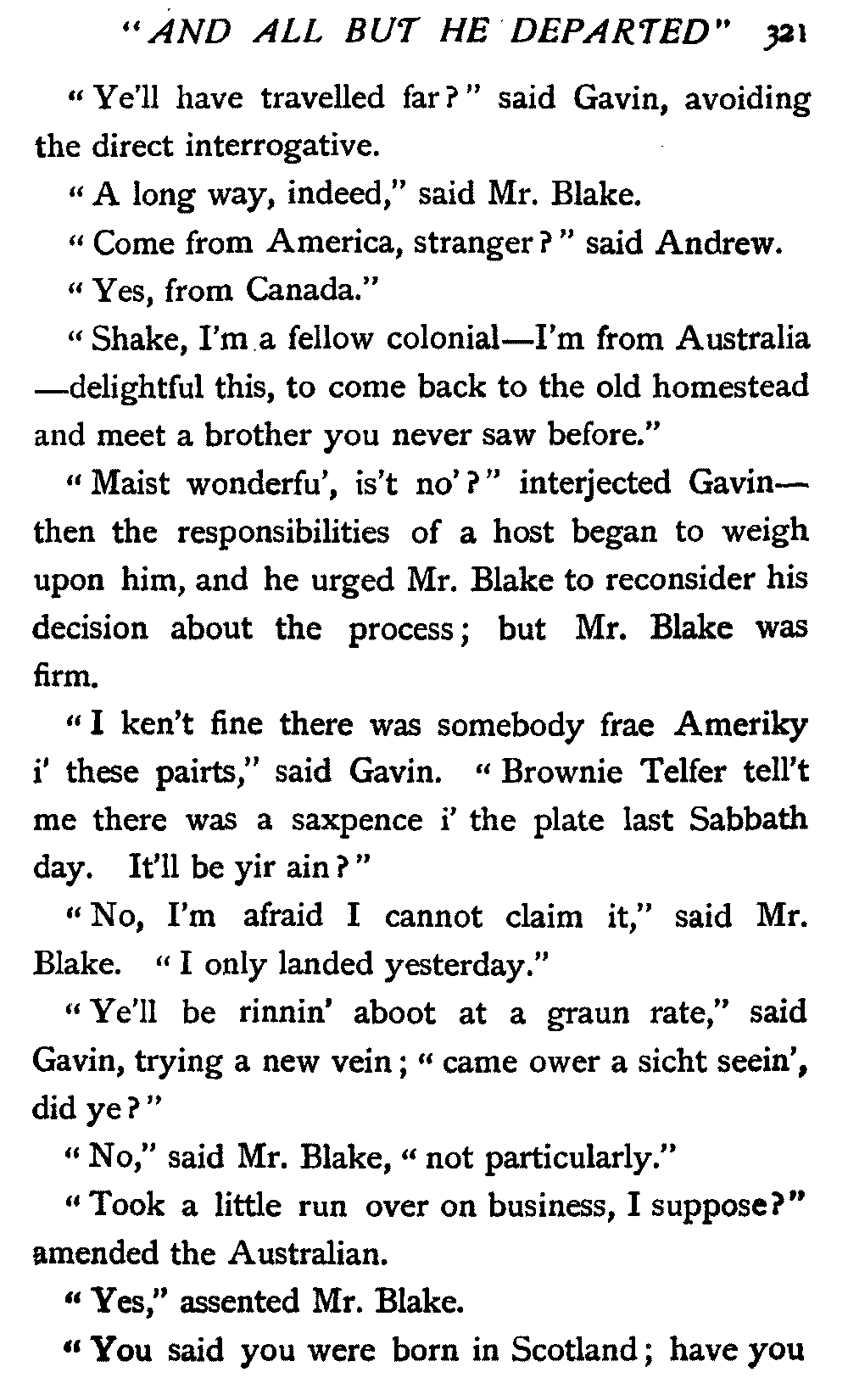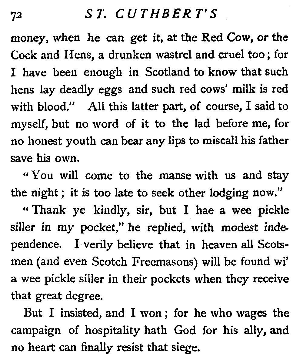 I had but well begun to compose my mind and to forecast the probable experiences of the morrow, when a rich Scotch voice broke in upon me with the unmistakable inquiry, "And where micht ye be gaein?"