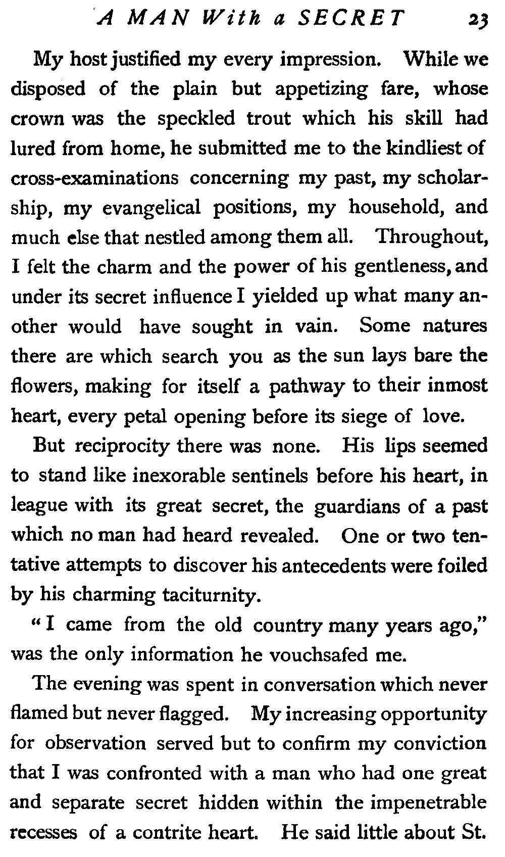 My questioner seemed to scarcely listen for my answer, yet a tutored eye could tell that he was camping on my trail.