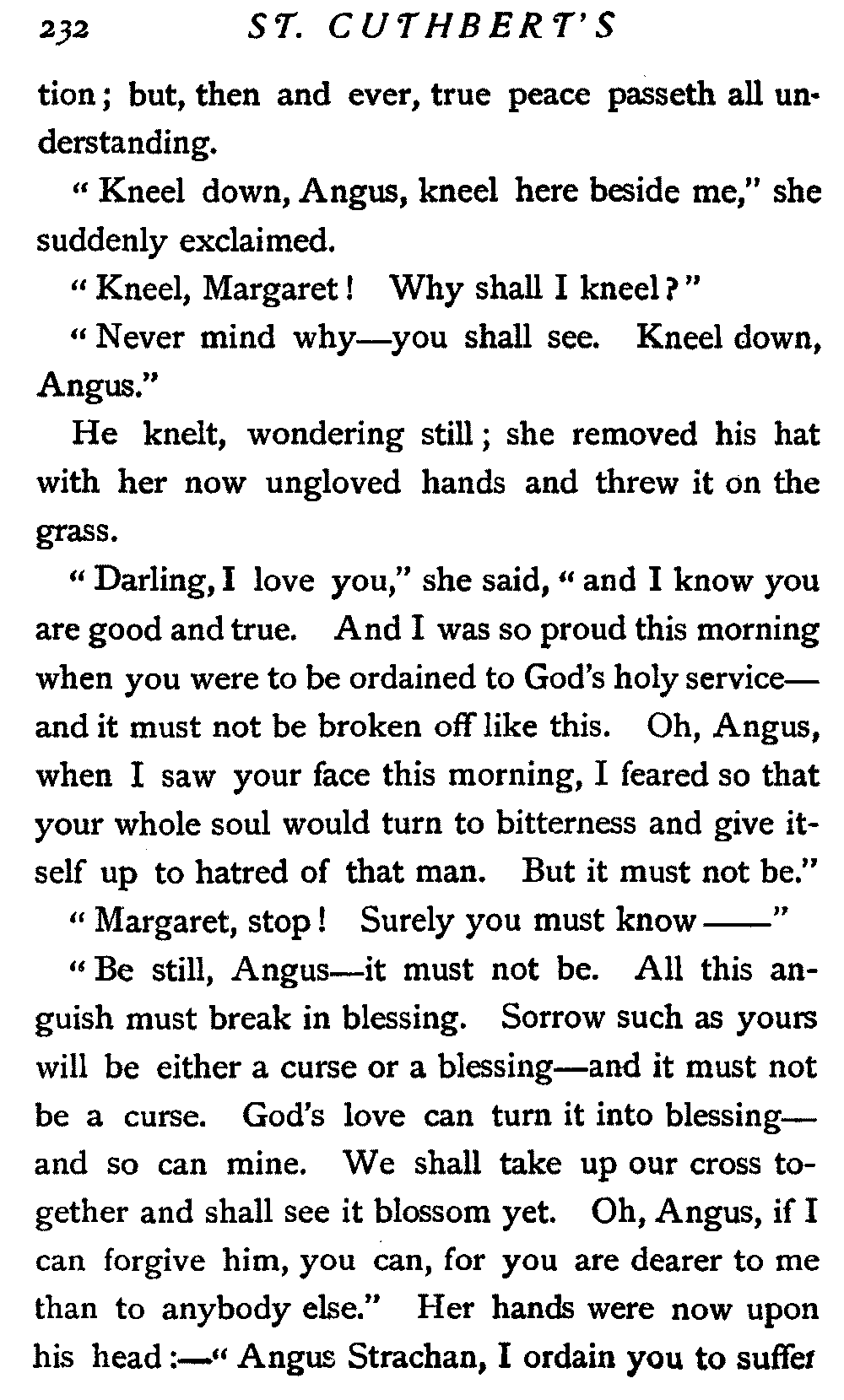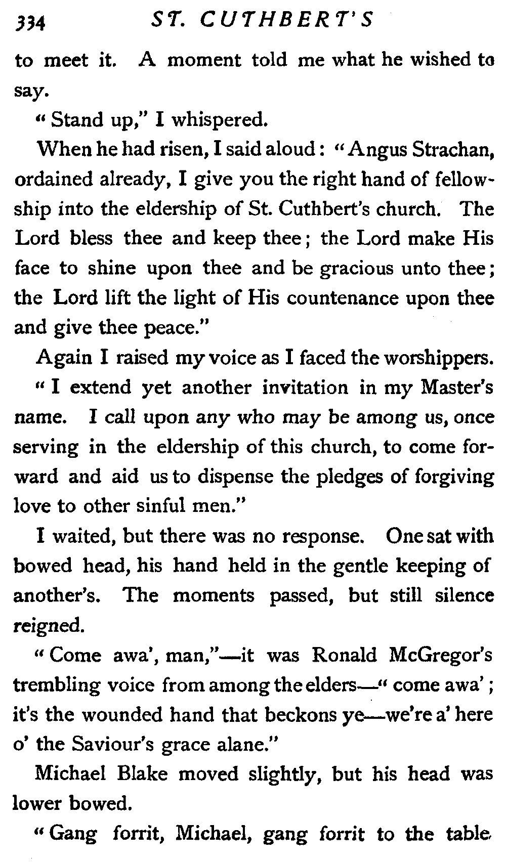 When he had risen, I said aloud: "Angus Strachan, ordained already, I give you the right hand of fellowship into the eldership of St. Cuthbert's church. The Lord bless thee and keep thee; the Lord make His face to shine upon thee and be gracious unto thee; the Lord lift the light of His countenance upon thee and give thee peace."